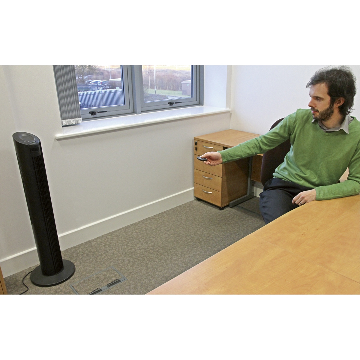 Slimline fan design, suitable for floor or desktop use. Remote control operation with 3-speeds and an 8 hour timer. Smooth running motor powers fan blades and oscillating gearbox to aid even air distribution. Fitted with 3-pin plug.