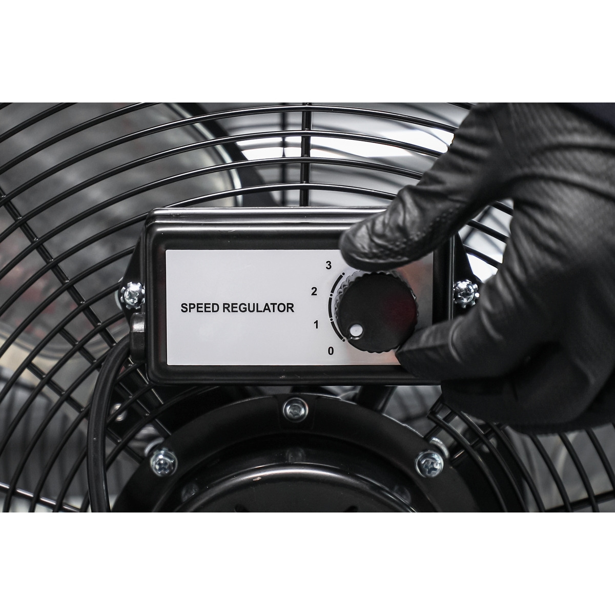 High velocity industrial 3-speed drum fan suitable for movement of huge volumes of air. Robust unit with heavy-duty gauge steel casing, guard and frame. Featuring a 360° tilt function allowing for the direction of airflow to be positioned anywhere on a 360° axis. Carefully balanced and fully guarded blades provide safe operation. Maximum Airflow: 123.5m?/min(4361cfm). Fitted with 3-pin plug. Suitable for industrial, commercial, agricultural, automotive workshop and showroom applications.