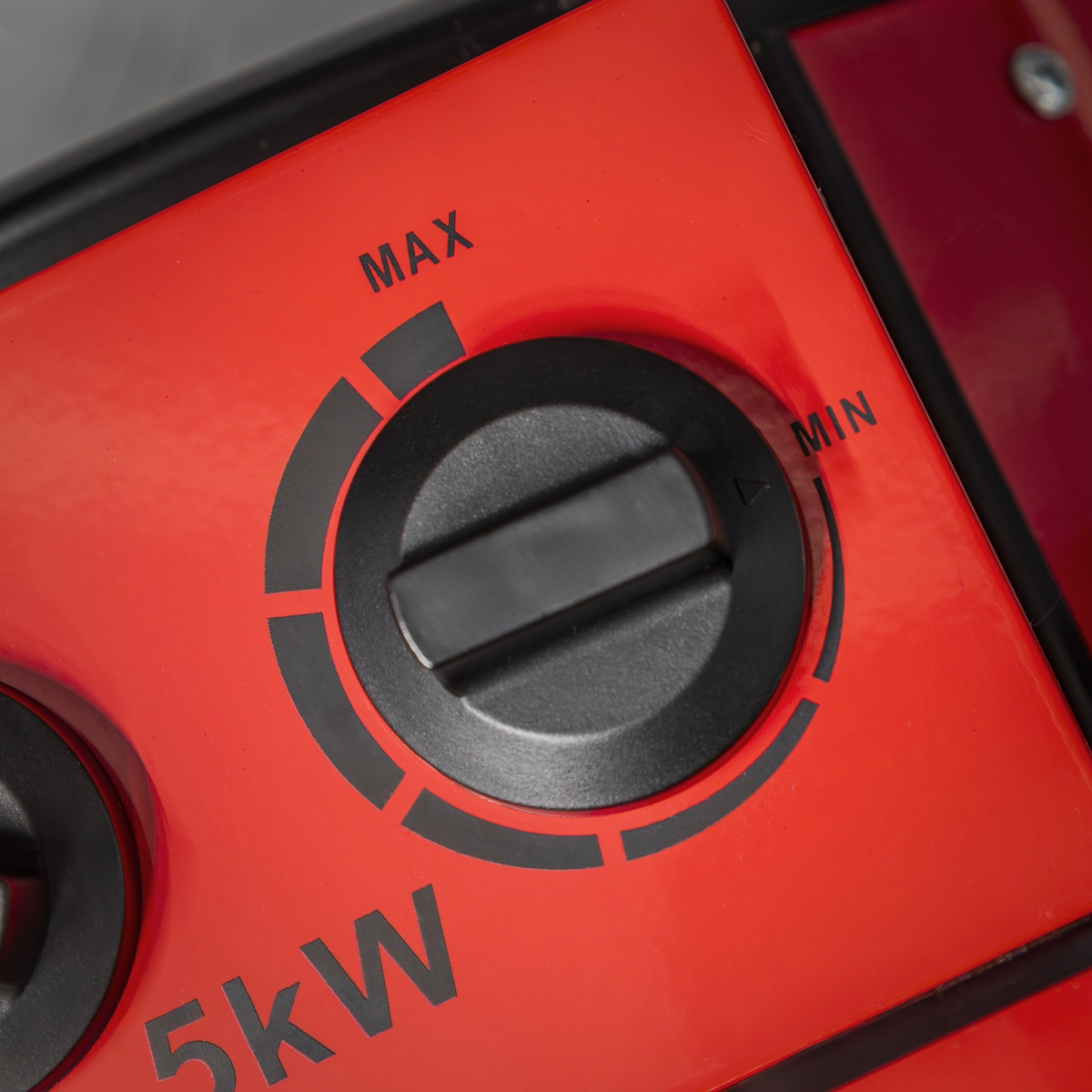 INDUSTRIAL FAN HEATER – 17,000 Btu/hr (5kW) Heat output, heats an area of 48m³. MULTIPLE SETTINGS – Two heat seatings with thermostatic control and a fan only option which are ideal for use in a workshop or garage environment. COOLING SYSTEM – Added cooling system to prevent over heating when in use. PORTABLE HEATER –The fan heater is easy to transport to different places as it is supplied with a carry frame. DRY HEAT – The unit produces a totally dry heat, with no condensation, no gas, no fumes or smell. SAFETY – Includes tip over switch for additional safety as well as front supports. CABLE – Supplied with 3-phase power cable and 16A plug.