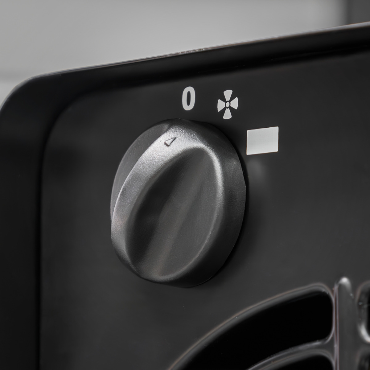 - TEMPERATURE CONTROL - One heat setting with thermostat control, plus fan only option.
