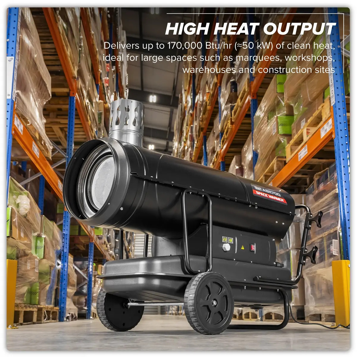 - HEAT OUTPUT - 50KW/170,000Btu/hr ideal for heating marquees, events, halls, workshops, warehouses, construction sites and more.