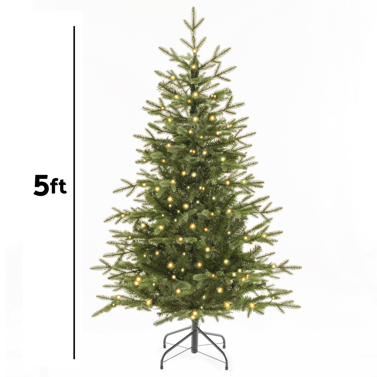IDEAL FOR SMALL ROOMS - This realistic 5ft Christmas tree is perfect for a small room and suitable for indoor use only. NO HASSLE - Pre-Lit with 190 warm white LED lights to save the stress of untangling the never-ending knots of traditional lights. REALISTIC DESIGN - Specially designed to include realistic pine branches using 772 PE tips and PVC construction for the trunk to make the tree look strong, full and bushy. FULLY TESTED - Our trees are tested to and comply with EN71-2 Flammability Clause 4.1. This includes the required tests concerning the flammability of a product. Made from fire retardant materials. EASY TO ASSEMBLE & STORE - Hinged branches make this Christmas tree easy to assemble and store away. FEATURES – A strong sturdy metal base, which folds away for easy storage. DIMENSIONS - Tree Width: 35".