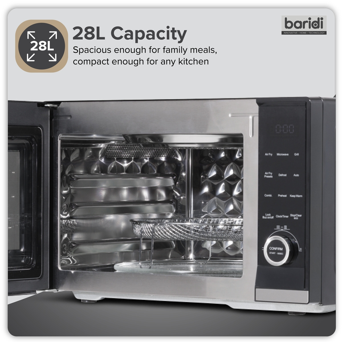 FAMILY FRIENDLY - Spacious 28L capacity is perfect for family meals or entertaining guests. VERSATILE - Features 7-in-1 functionality with ai r fry, microwave, grill, combi, defrost, pre-heat and keep warm settings. EASY TO USE - Nine preset programmes ensure you can easily prepare a variety of dishes with the push of a button. ACCESSORIES - Supplied with a chrome mesh frying basket and a non-stick steel grill plate. DIMENSIONS (W x D x H): 526 x 447 x 324mm