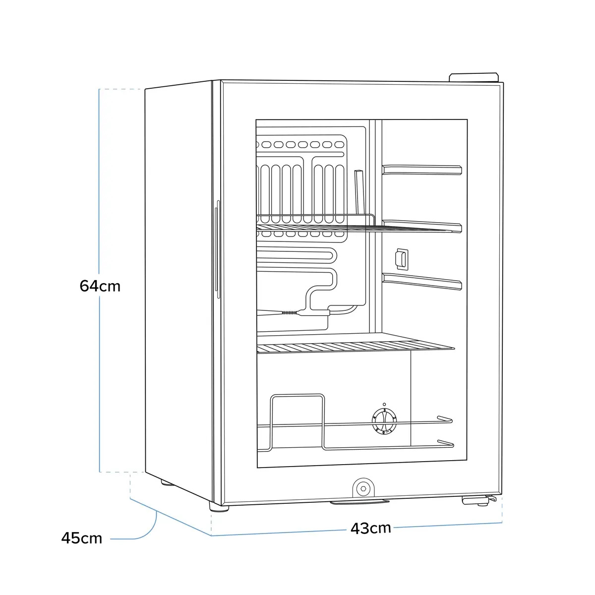 TEMPERATURE CONTROL - Using direct compressor cooling technology to give a temperature range between 3-18°C. The built-in thermostat can control the temperature to your preference. LARGE CAPACITY - 60L Size means plenty of room for beer, wine and soft drinks with space for up to 74, 330ml cans. FEATURES Two removable metal shelves and wire rack. Also including an LED light and built-in security lock to keep your drinks where you left them. DIMENSIONS (W x D x H): 43 x 45 x 64cm. ANNUAL ENERGY CONSUMPTION - 75 KWh/a.