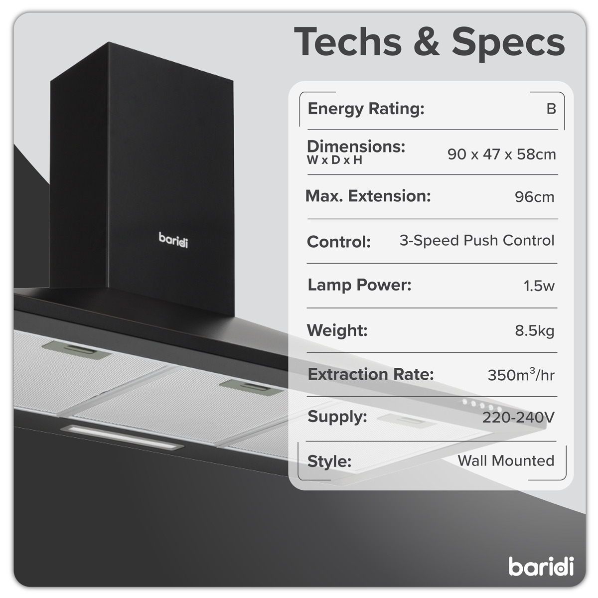 ENERGY EFFICIENCY - Save money with a class B extractor hood compared to the class C hoods. Higher efficiency means less noise and a more powerful fan without the need for higher electricity bills. POWERFUL FAN - 65 Watts of power with 330m³/h of suction is more than enough to freshen your kitchen and keep cooking fumes out of the rest of your house. With three fan speeds you're in full control. STYLISH DESIGN - This elegant and modern wall hood featuring a 1.5W LED light will effortlessly bring style to any kitchen design. CLEAN AIR- Supplied with carbon filters (x2) to keep your air fresh (also available separately, Model No. DH132). STANDARD SIZE - 90cm Chimney style cooker hood covers the majority of cookers and hobs. DIMENSIONS (W x D x H) - 90 x 47.5 x 58/96cm. *Must be installed by a qualified electrician.