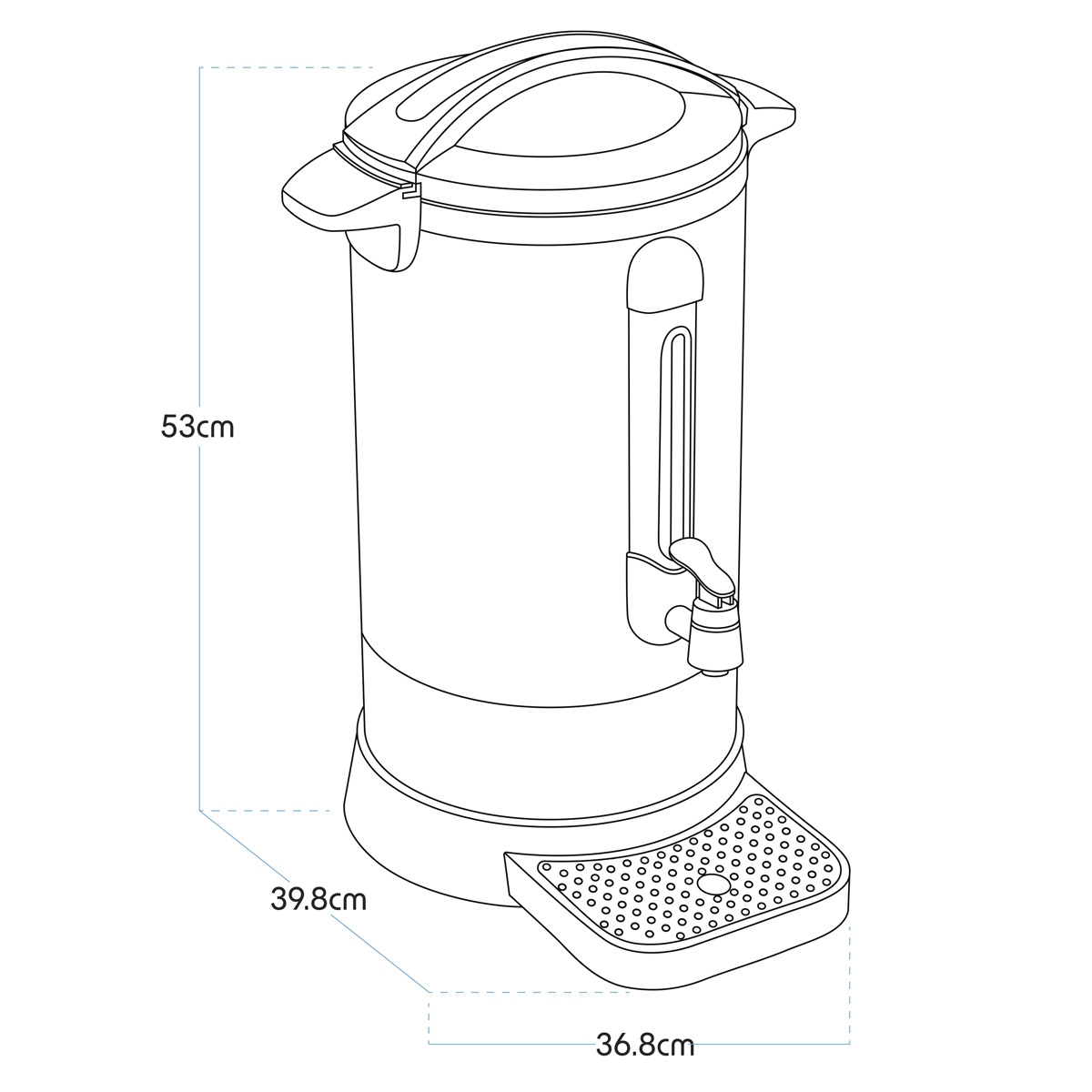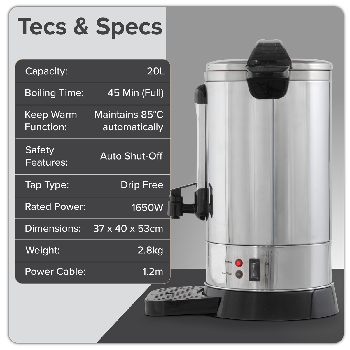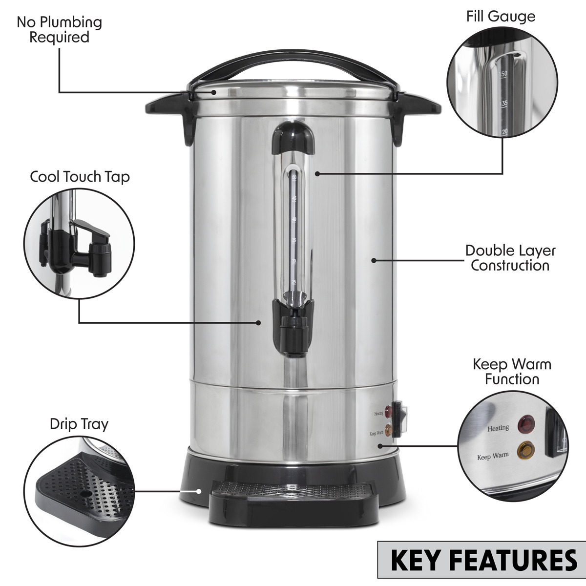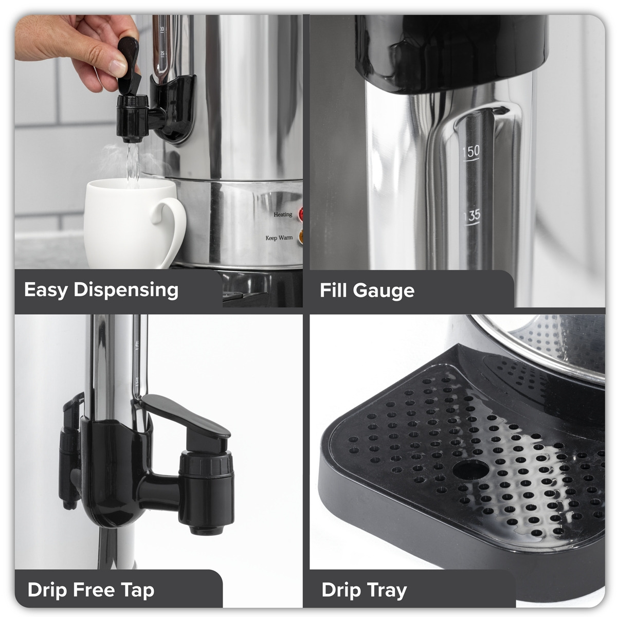 20L CAPACITY - Sufficient for large batches of hot water, ideal for gatherings or frequent use without constant refilling. DOUBLE LAYER - Stainless steel body ensures durability and heat retention. ACCESSORIES - Includes drip tray to catch any spills, keeping the surrounding area clean and tidy. FUNCTIONALITY - Keep warm function ensures your water stays at the desired temperature. WATER GAUGE - Enables easy monitoring of water levels without the need to open the boiler.