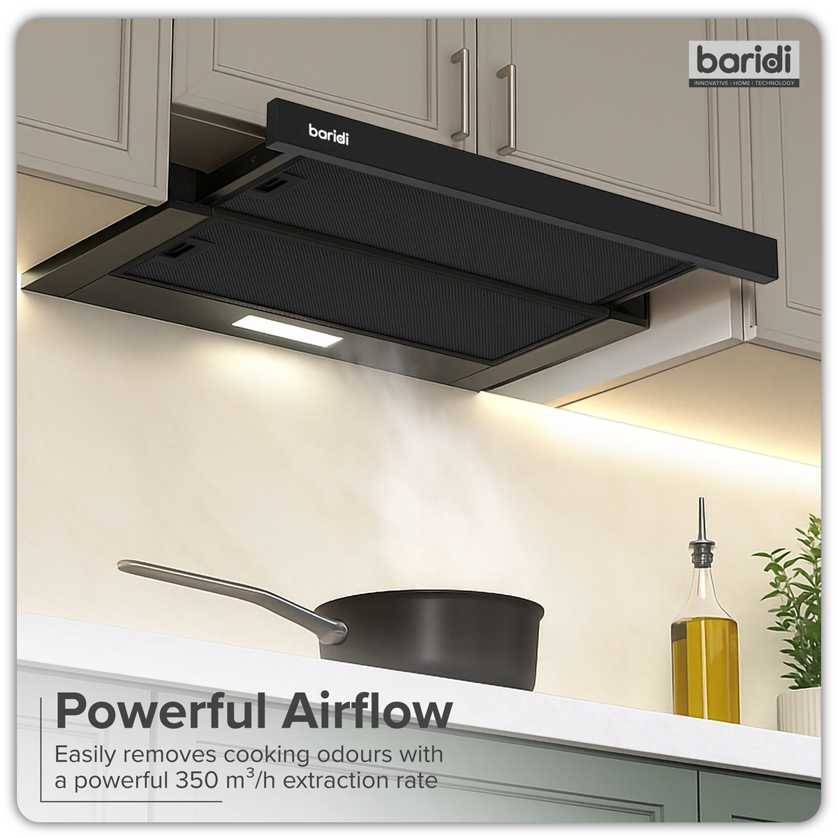 - POWERFUL FAN - 33 Watts of power with 350m³/hr of suction is more than enough to freshen your kitchen and keep cooking fumes out of the rest of your house.