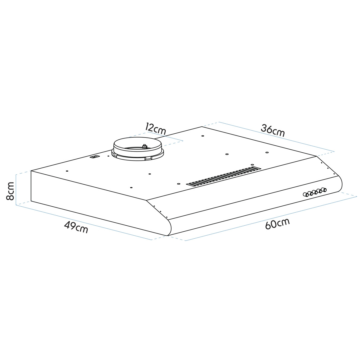 POWERFUL FAN - 85W of power with 220m³/hr of suction is more than enough to freshen your kitchen and keep cooking fumes out of the rest of your house. With three fan speeds you're in control. VERSATILE – Supplied with a carbon filter mat to keep your air fresh and give you the option to recirculate the air or vent externally. STANDARD SIZE - 60cm Chimney style cooker hood covers the majority of cookers and hobs. STYLISH DESIGN - This elegant yet modern wall hood delights, effortlessly bringing style to any kitchen type. LED LIGHTING - 2W Light provides a clear view of your cooking area with minimum energy consumption. DIMENSIONS (W x D x H) - 60 x 49.2 x 8cm.