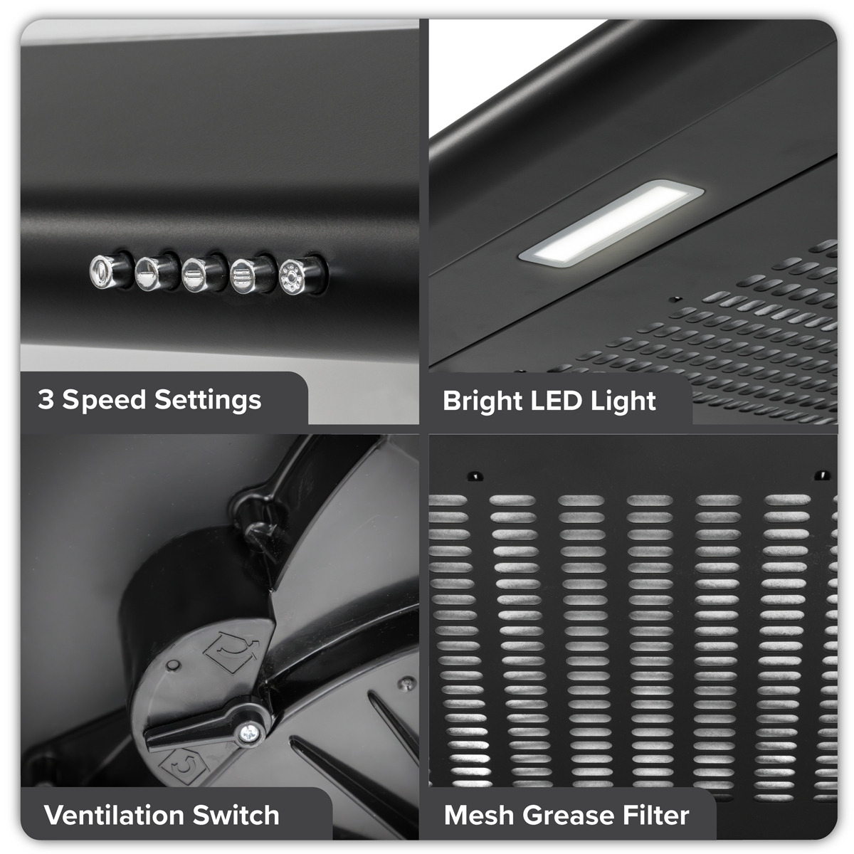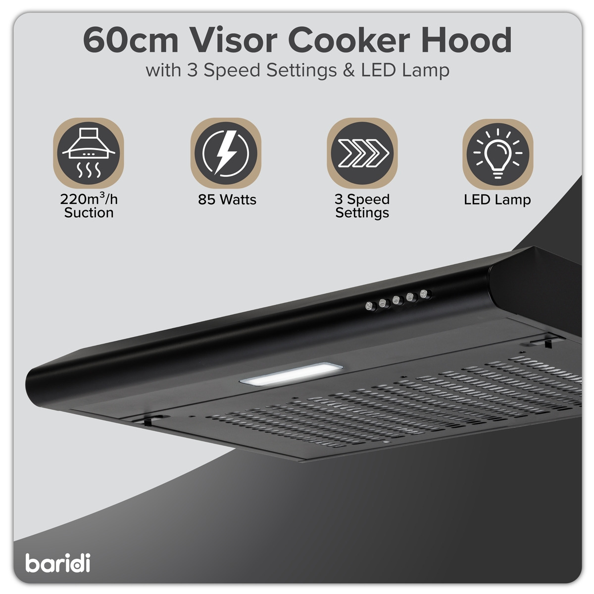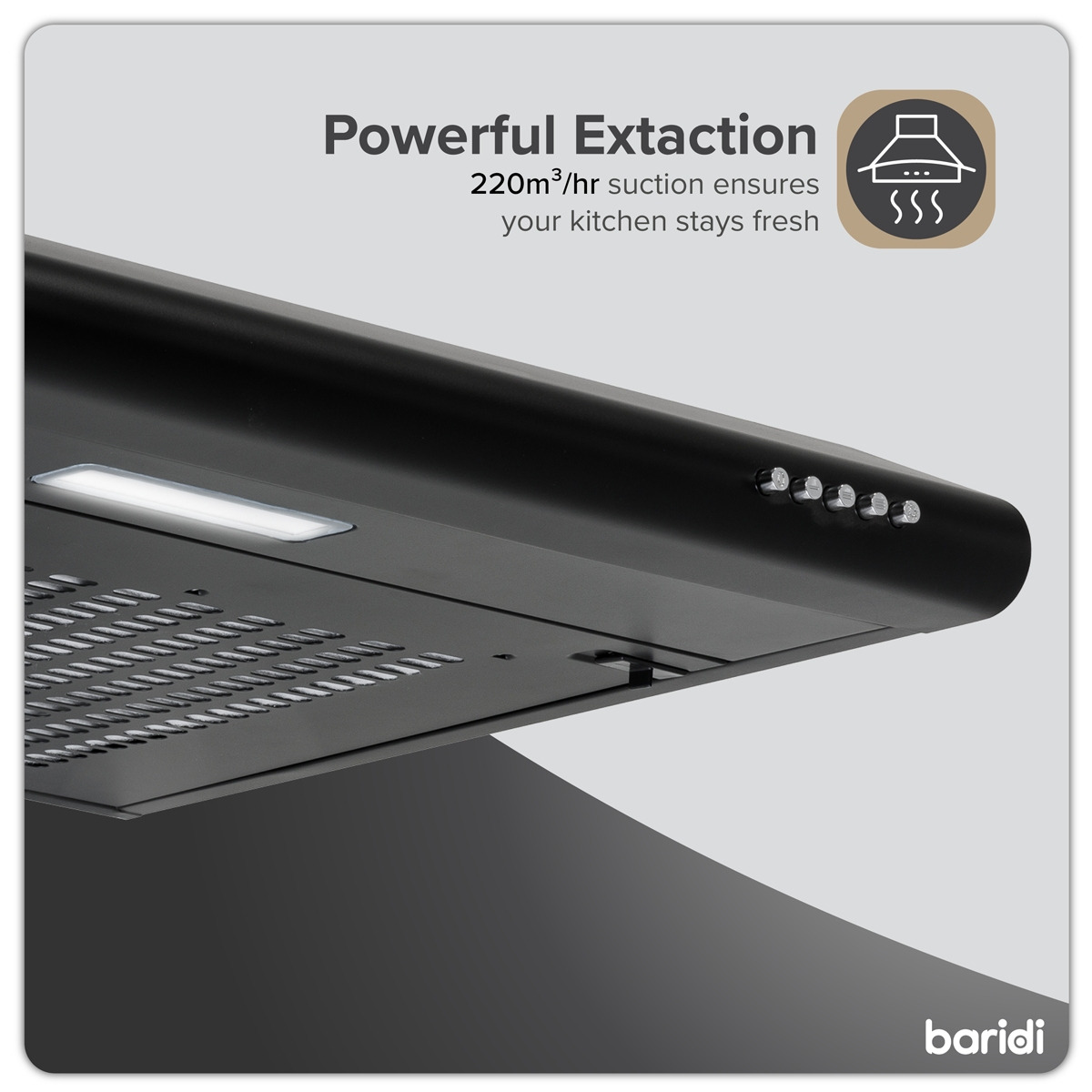 - POWERFUL FAN - 85W of power with 220m³/hr of suction is more than enough to freshen your kitchen and keep cooking fumes out of the rest of your house. With three fan speeds you're in control.
