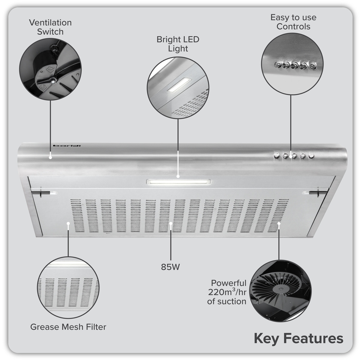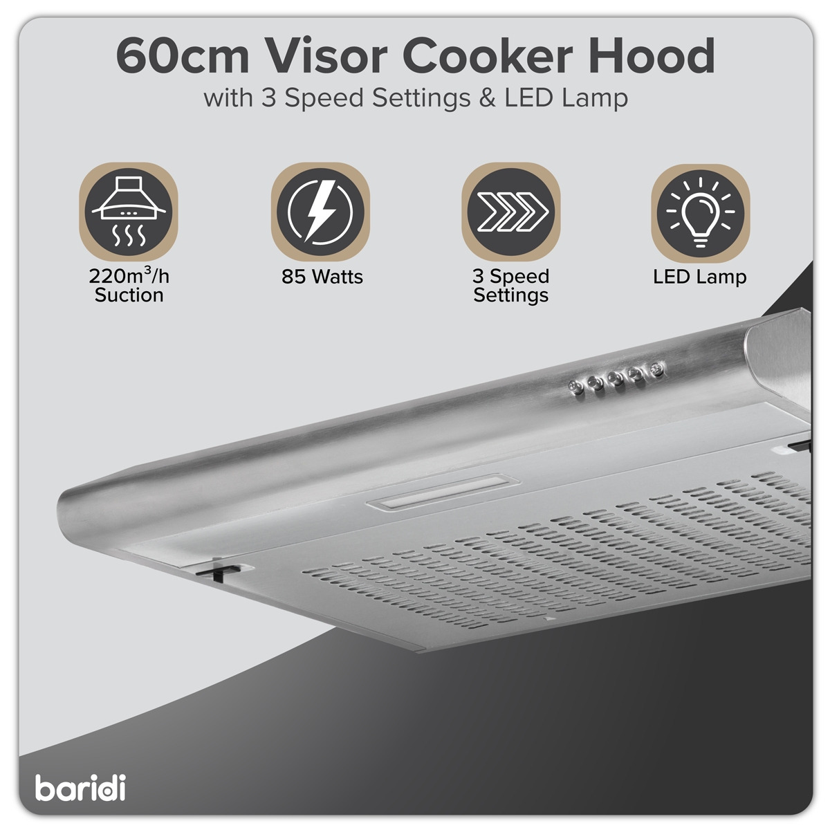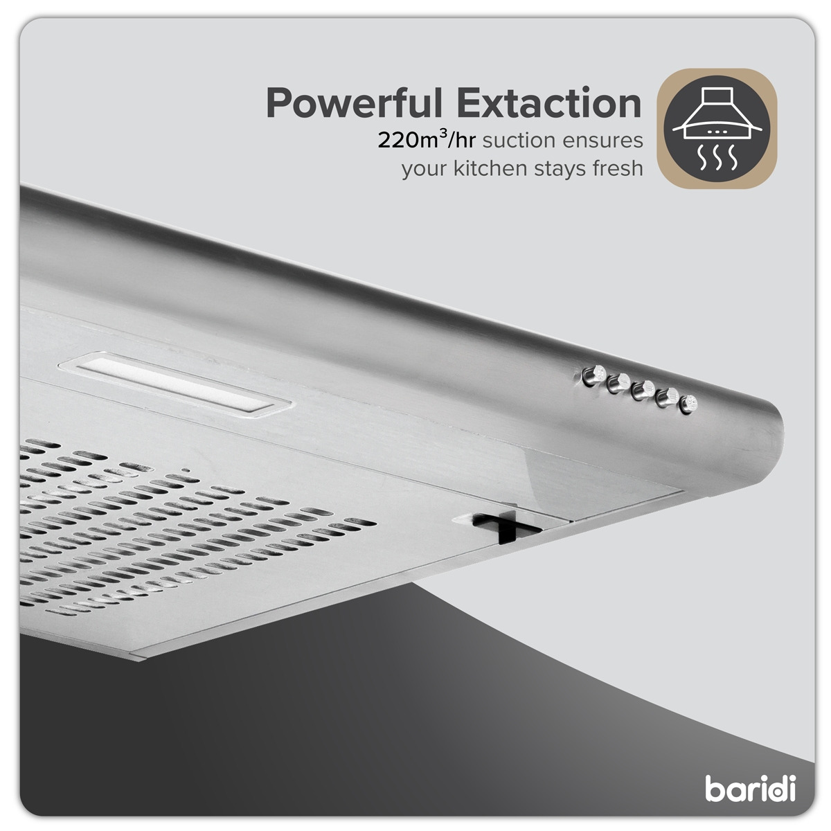 - POWERFUL FAN - 85W of power with 220m³/h of suction is more than enough to freshen your kitchen and keep cooking fumes out of the rest of your house. With three fan speeds you're in control.