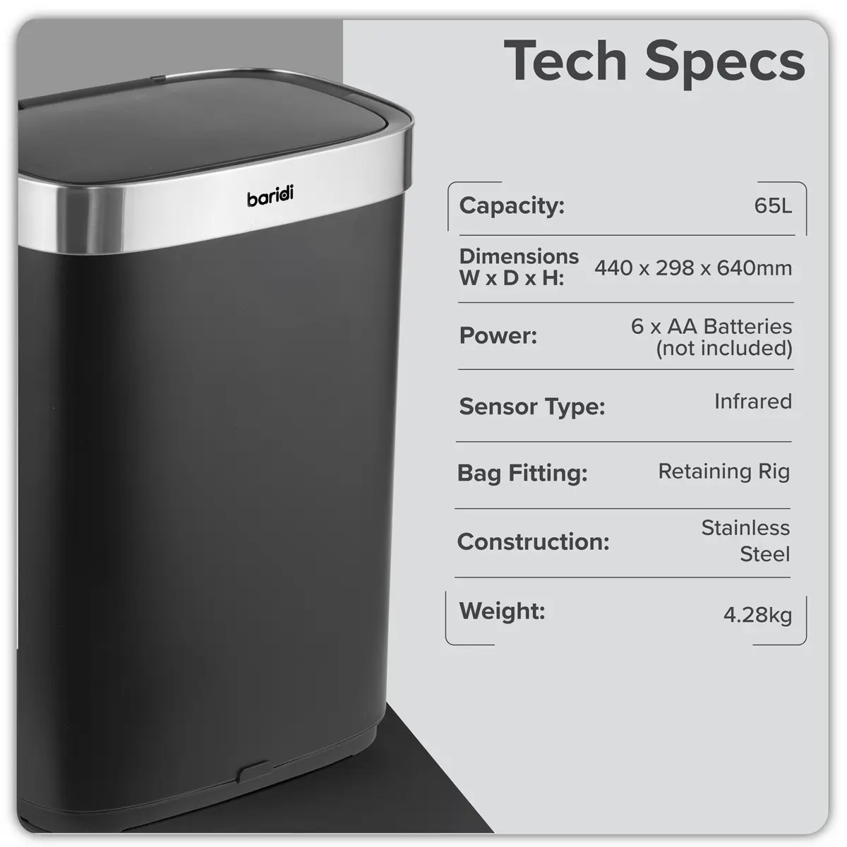 65L CAPACITY - Spacious design, ideal for home and office use. TOUCH-FREE - Motion sensor opens the bin automatically for hygienic waste disposal. NO CABLES - Powered by 6 x AA batteries (not included), keeping the floorspace clean. RING RETAINER - Keeps bin liners securely in place for a neat look. DIMENSIONS (W x D x H) - 44 x 29.8 x 64cm.