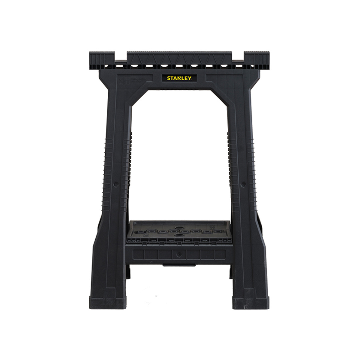 The Stanley 170355 Junior Sawhorses have an all plastic construction with Non-slip rubber inserts in the top for added grip when working on the project in hand and non-slip rubber feet for added stability and safety. The saw horses will fold flat for easy transportation and storage.