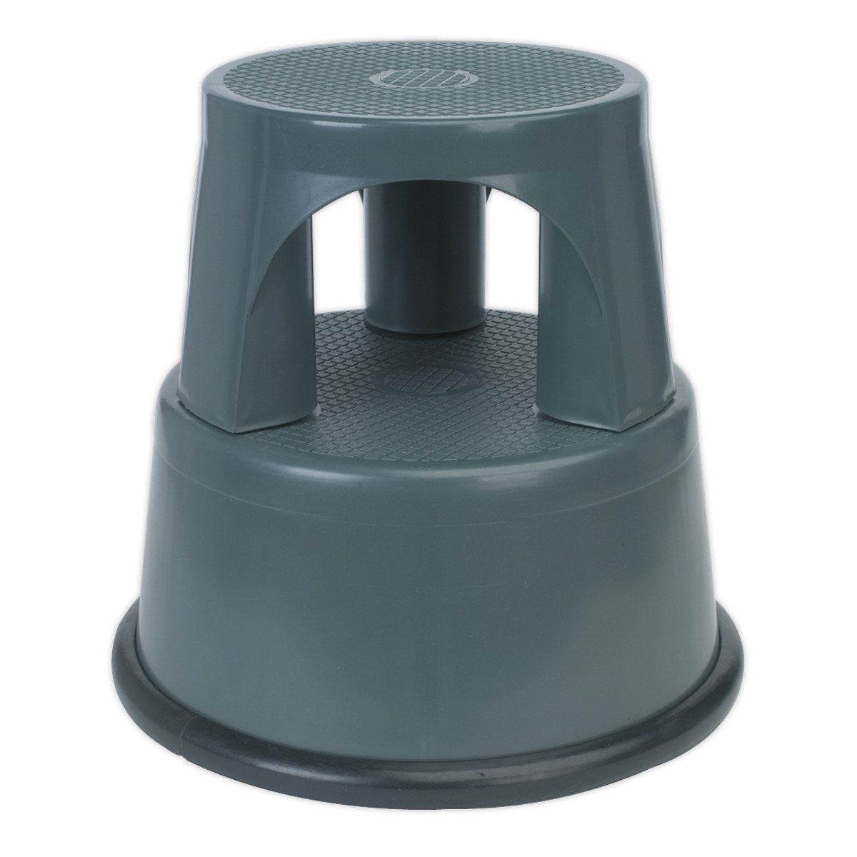 Step Heights: 220, 420mm. Base Diameter: Ø440mm. Capacity: 150kg. EN 14183 Tested, robust composite construction with non-slip surface. Three spring loaded wheels allow step to glide over floor, yet sit down firmly on rubber stops when load is applied.