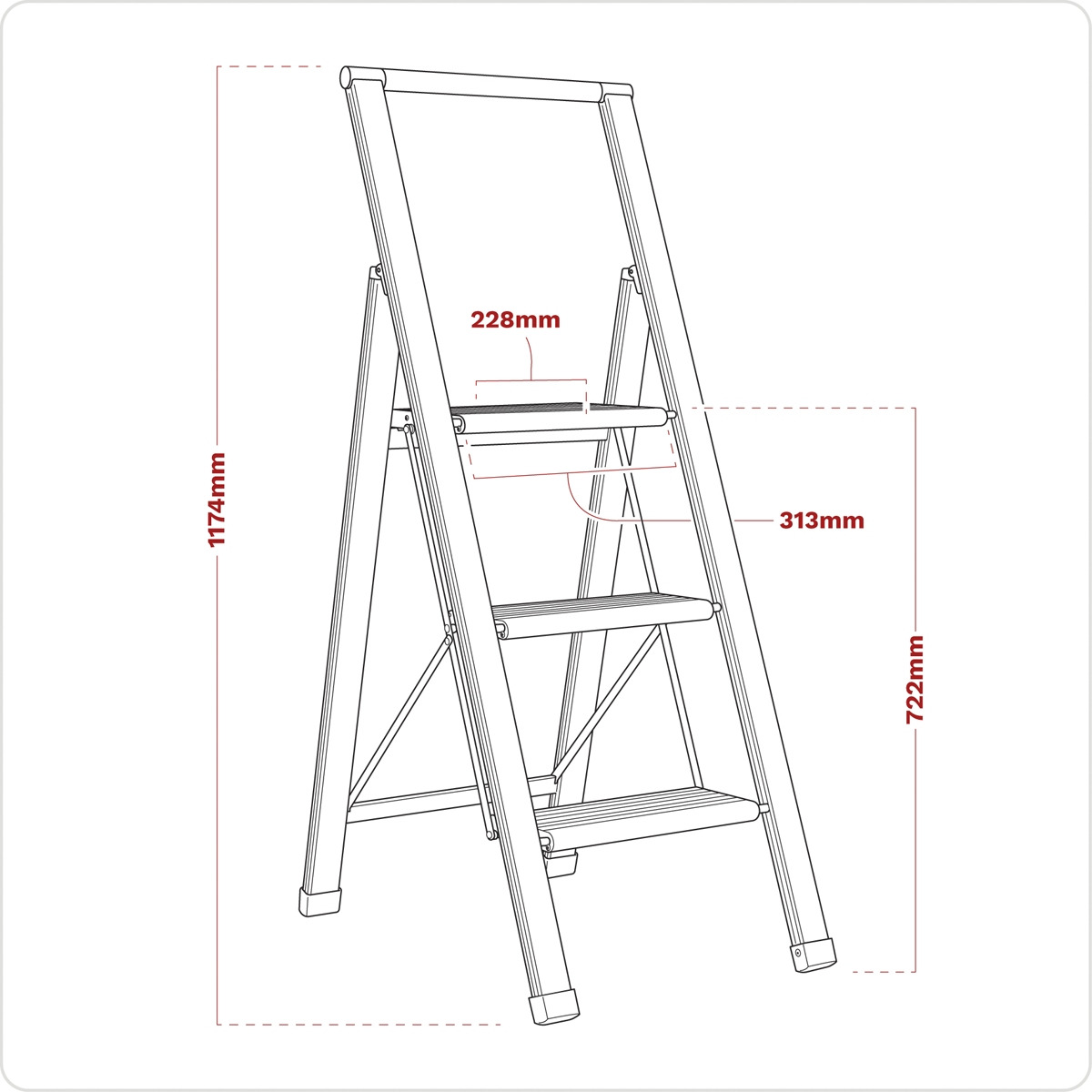 EN 14183 Approved 150kg capacity step ladder professionally manufactured with brushed aluminium frame. Features large steps fitted with anti-slip rubber inserts and a large top step for added stability when working at height. Ladder folds down flat for easy storage and transportation. Fitted with four rubber feet for added stability. Top Step Height: 722mm. Top Step Size: 313 x 228mm.