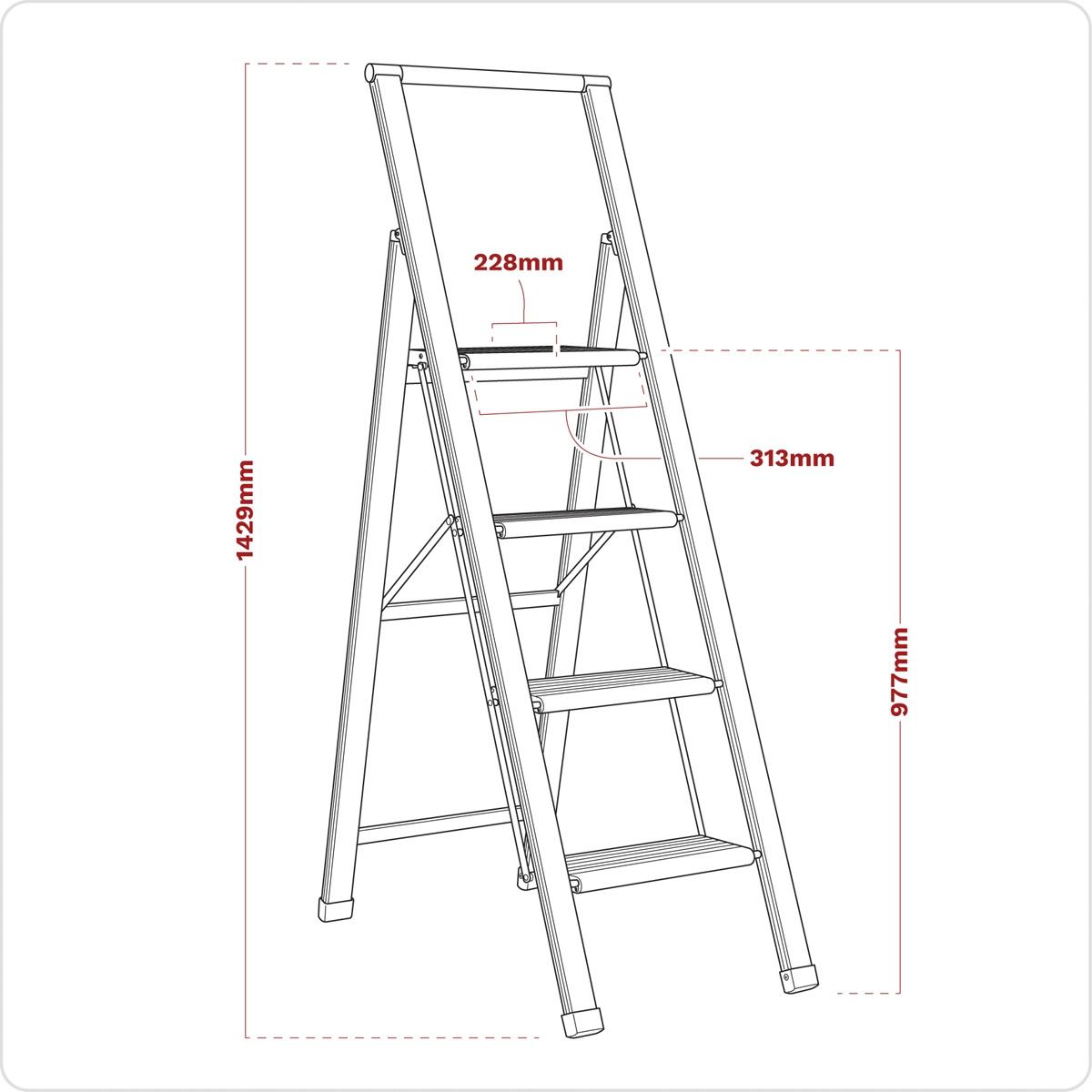 EN 14183 Approved 150kg capacity step ladder professionally manufactured with brushed aluminium frame. Features large steps fitted with anti-slip rubber inserts and a large top step for added stability when working at height. Ladder folds down flat for easy storage and transportation. Fitted with four rubber feet for added stability. Top Step Height: 977mm. Top Step Size: 313 x 228mm.