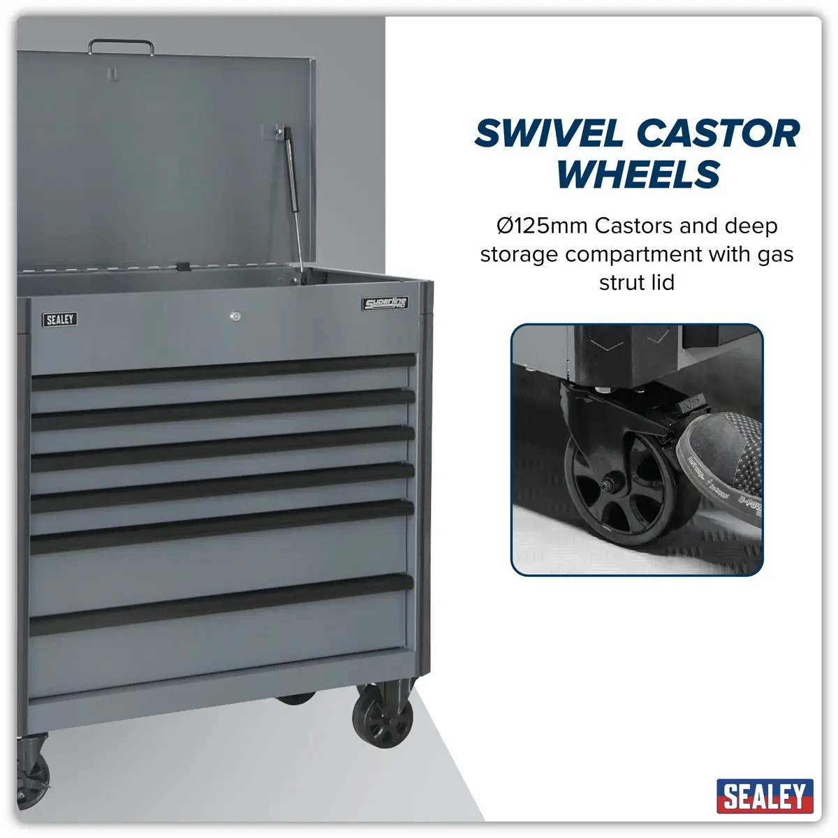 BUILT-TO-LAST - Manufactured from double skin side walls. SECURITY - Full length locking bars secure all drawers when the lid is closed which can then be locked by the barrel lock supplied with two keys. WORKSHOP READY - Coated in high-gloss triple baked enamel for protection against oil, dirt and mild solvents. PROTECTION - Full length TPR anti-shock protective bumpers on all corners prevent damage when moving around the workshop. MANOEUVRABILITY - Fitted with four stylish Ø125mm castors and a durable shatterproof plastic side handle. ACCESSORIES - Supplied with a can storage tray, waste bin and paper roll holder. DRAWERS - Six soft close drawers each supplied with a cut-to-size non-slip liner. EXTRA STORAGE - Deep storage compartment inside of the gas strut lid supplied with non-slip liner. OVERALL SIZE (W x D x H) - 973 x 482 x 1013mm. COVER - 5 Year Guarantee*.
