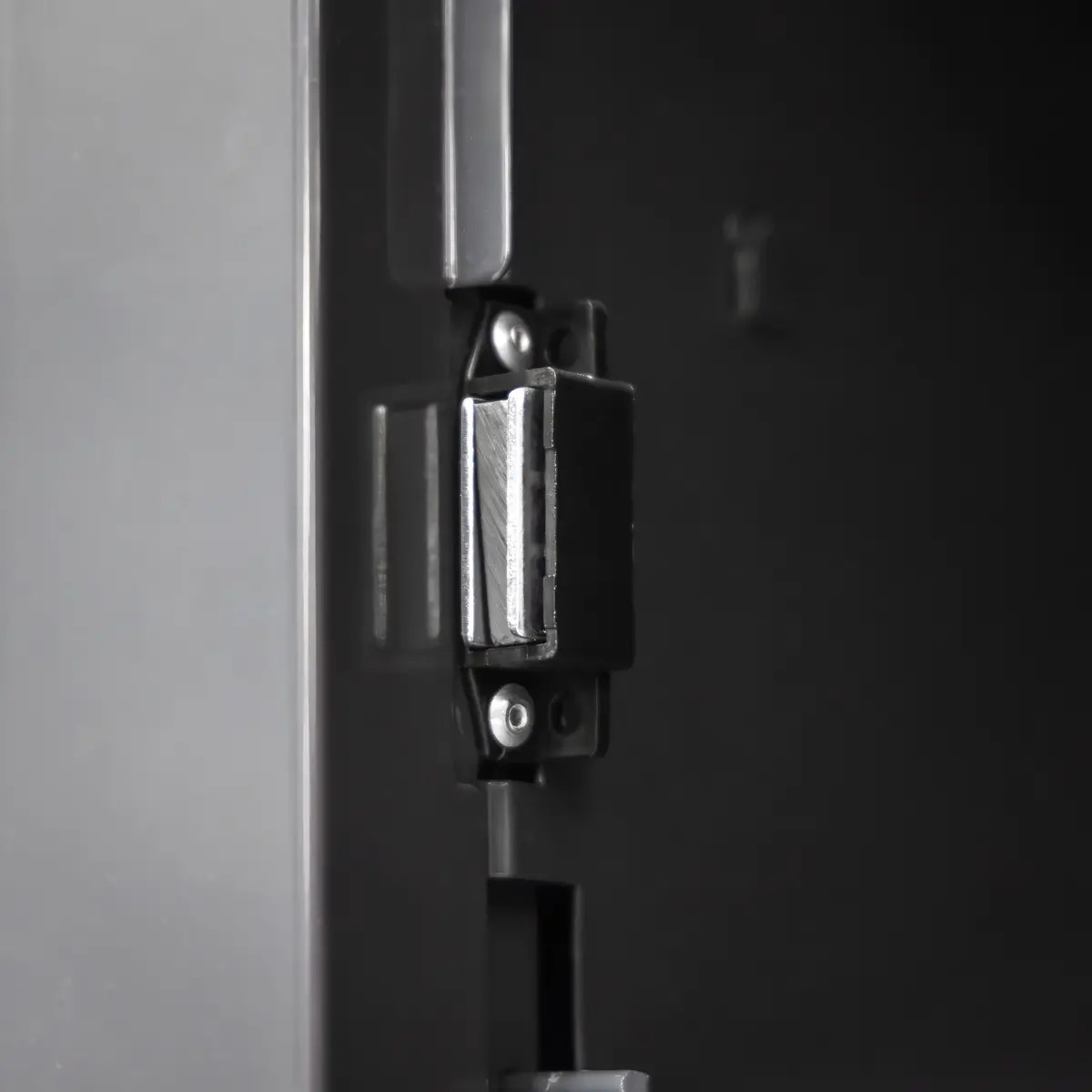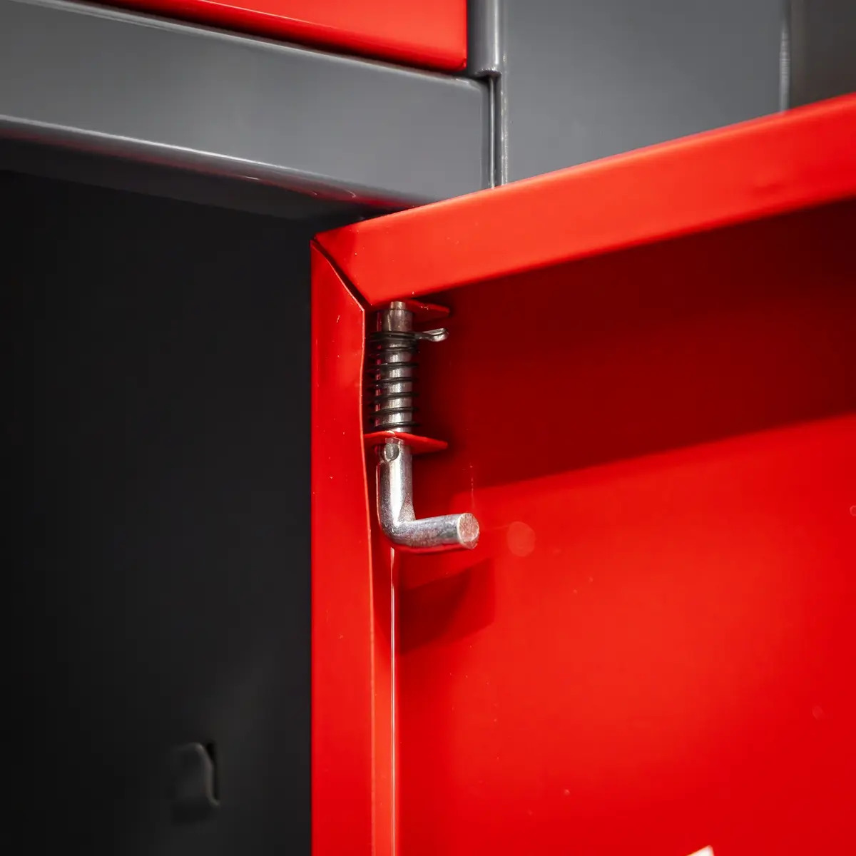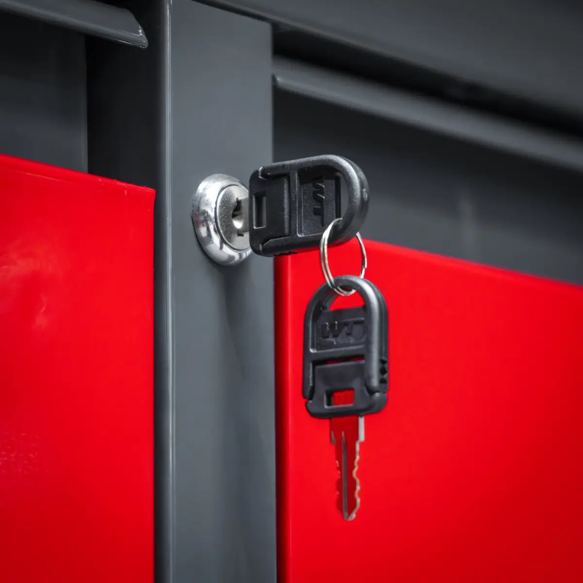 Heavy-duty powder coated metal frame with a 40mm MDF work surface. Features two drawers with ball-bearing slides and two cupboards. Features a central locking system and adjustable feet to help stability when placed on an uneven surface. Supplied flat-packed with two keys. Overall Size (W x D x H): 1200 x 600 x 865mm.