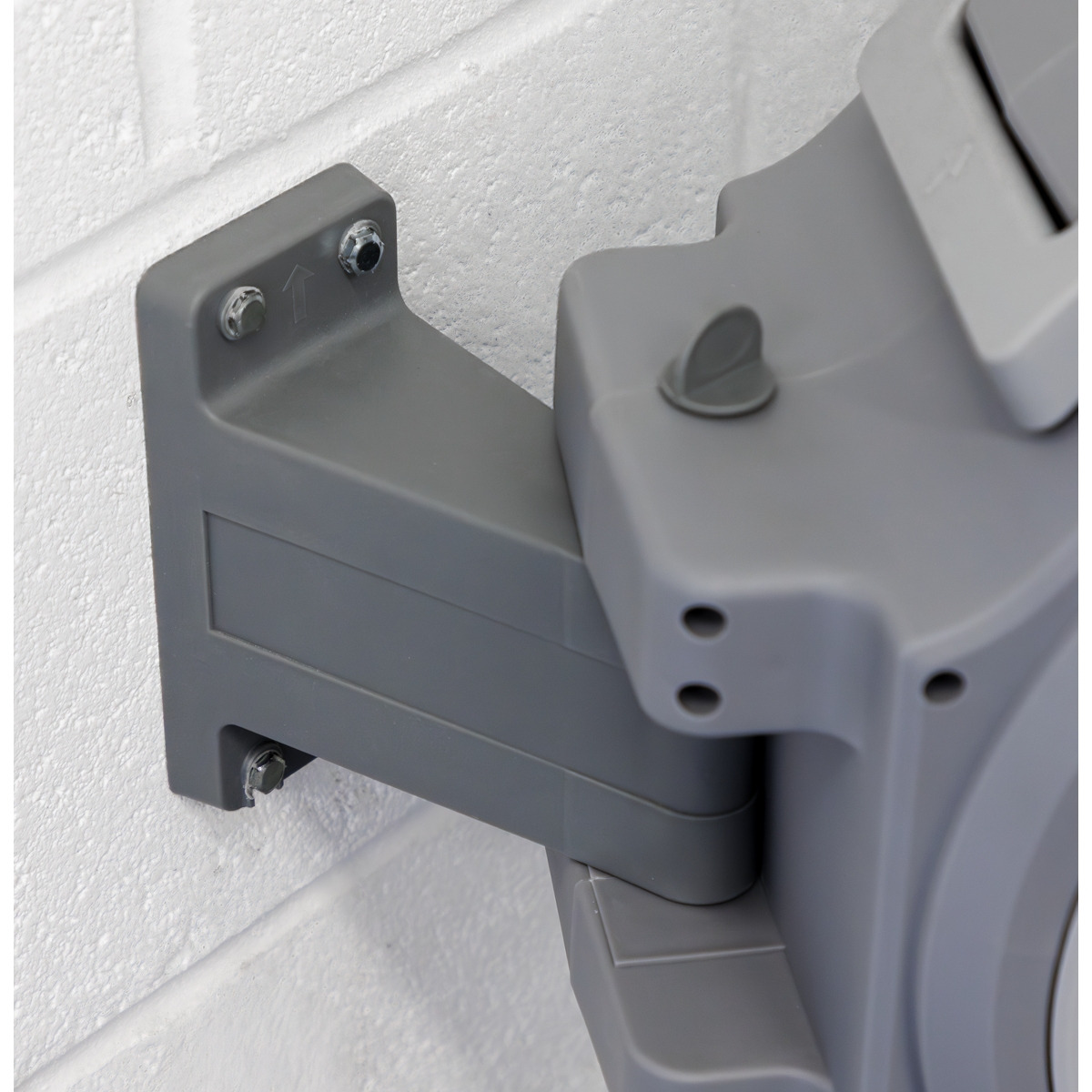 STURDY - Composite housing with heavy-duty wall mounting swivel bracket. POWERFUL - Fitted with 30m Ø13mm PVC garden hose with spray/jet nozzle. CONVENIENT - Hose can be extended and stopped at any length. INNOVATIVE - Controlled, slow rewind which, unlike traditional retractable reels, returns the water hose at a safe speed. SNAG-FREE - Auto-layering mechanism distributes water hose evenly back into reel housing preventing it from jamming. EASY FIT - Supplied with 2m leader hose with quick coupler and tap connector.