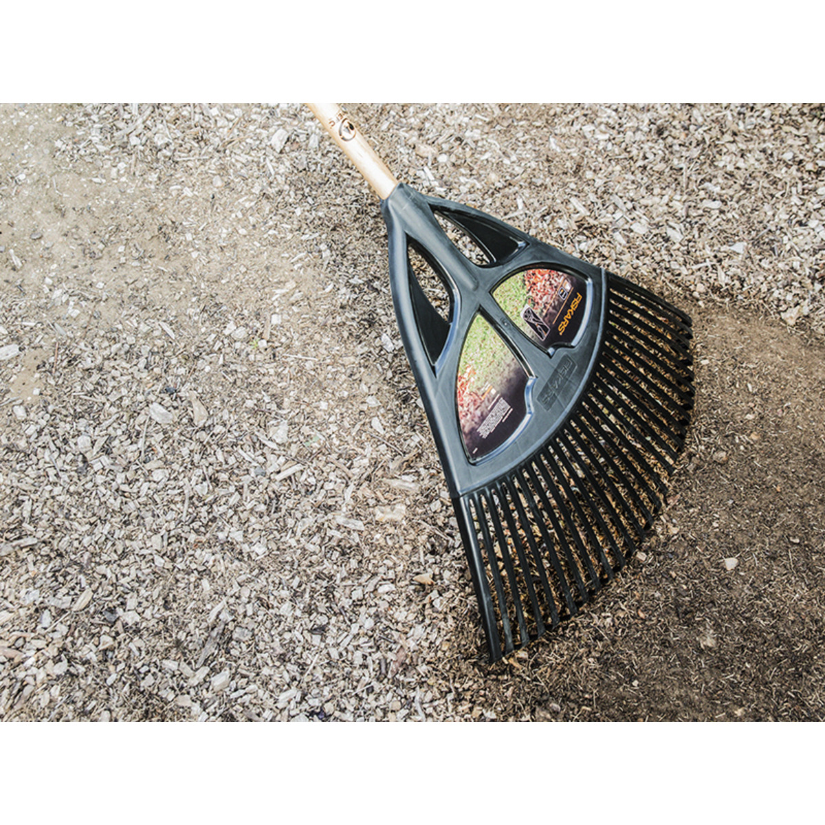 The Fiskars XL Leaf Rake has an extra wide head. Its flat, rigid and curved plastic tines prevent leaves from sliding up and blocking the head.