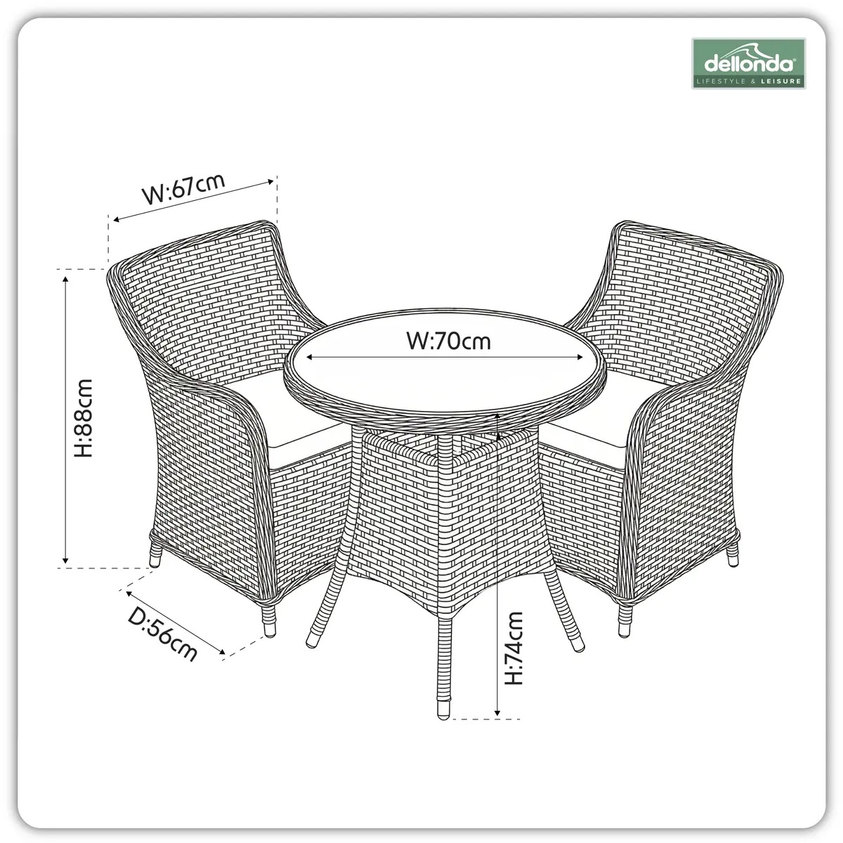 - DIMENSIONS - Chairs (W x D x H): 56 x 67 x 88cm, Table (Ø x H): 70 x 74cm.