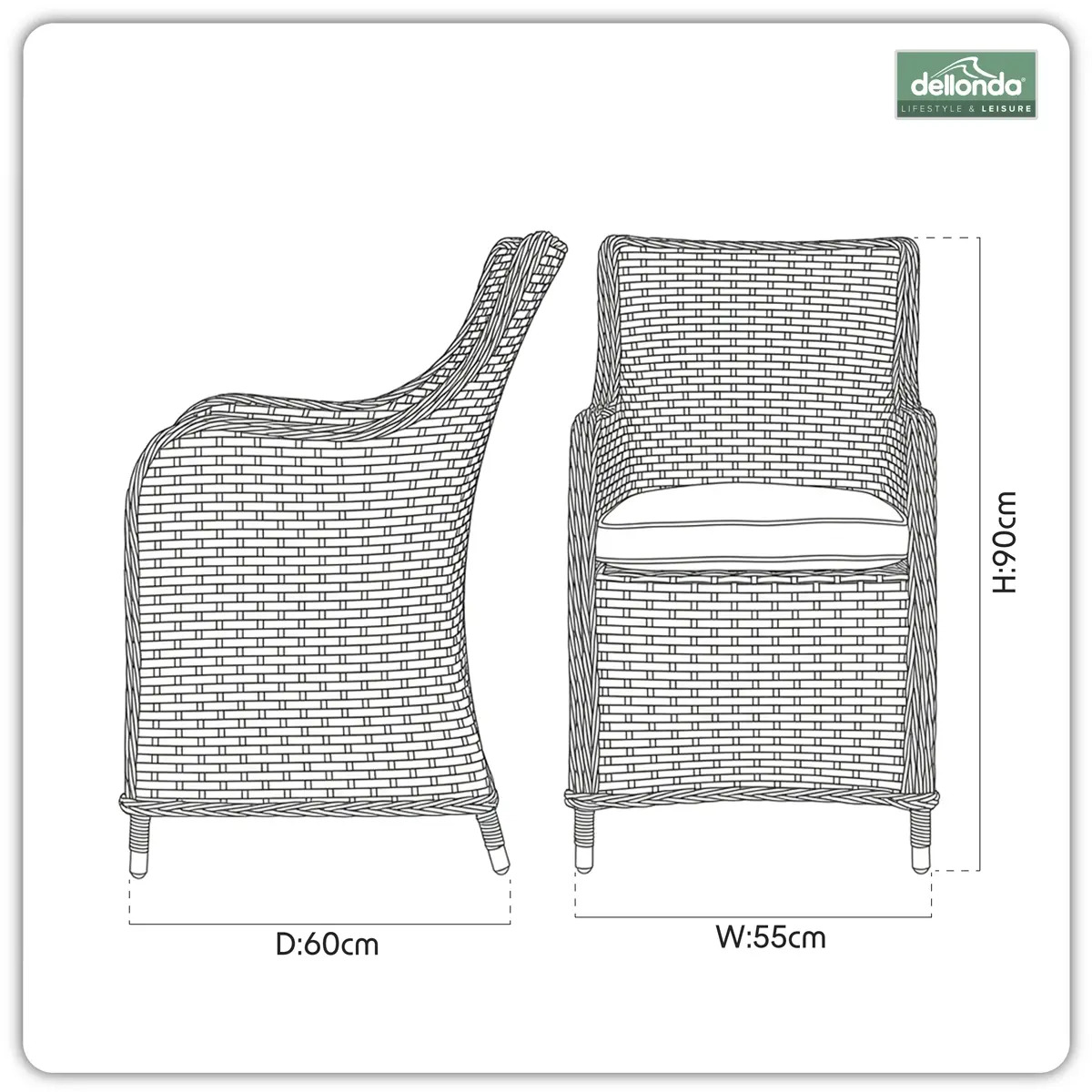 STYLISH DESIGN - These modern rattan dining chairs look great in any outdoor space from large gardens to small patios and balconies. WEATHER-RESISTANT - The premium quality PE weave rattan material has been UV Treated, is fade resistant and can be used outside all year round. LOW MAINTANENCE - The cushion covers are easily removable and can be hand washed, keeping the maintenance of your furniture as low as possible. STRONG & DURABLE - Stainless steel leg supports prevent damage during movement and keep your furniture sturdy during use. DIMENSIONS (W x D x H) - 56 x 67 x 88cm. 3 Year Guarantee*.