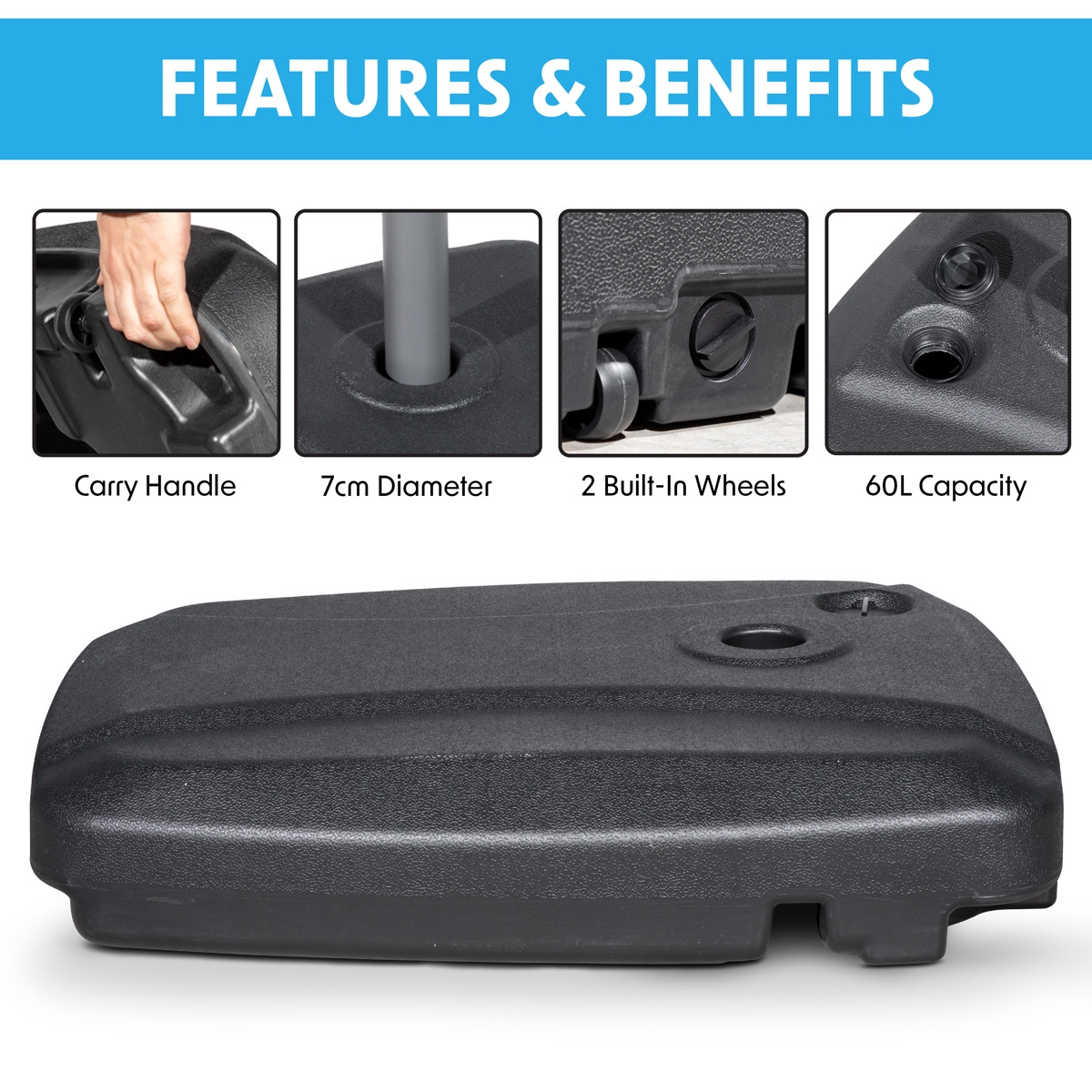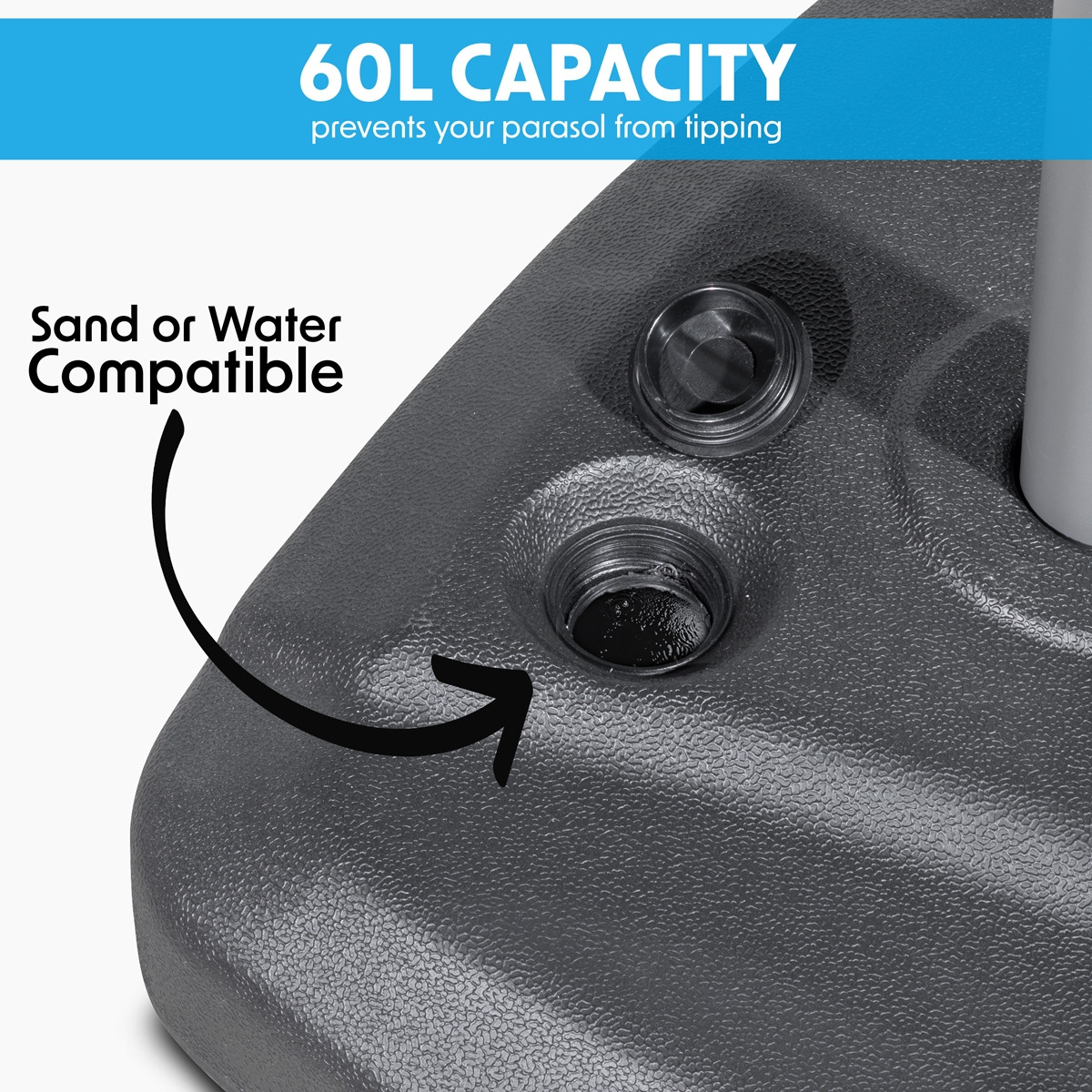 - LARGE CAPACITY - This base has a large capacity of 60L and is fillable with either sand or water.
