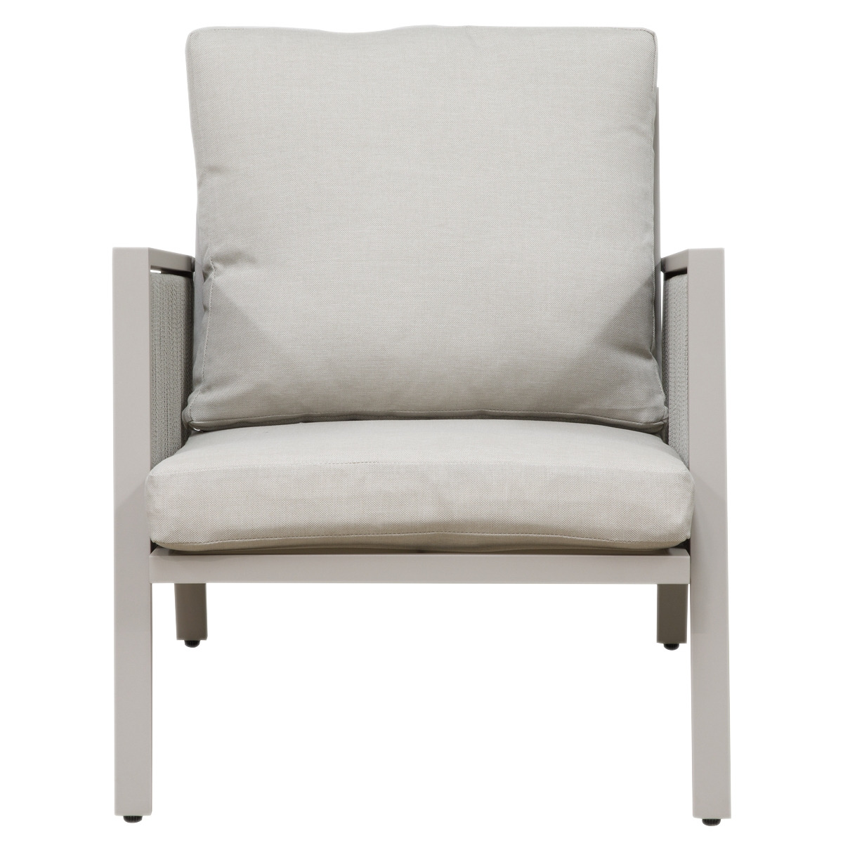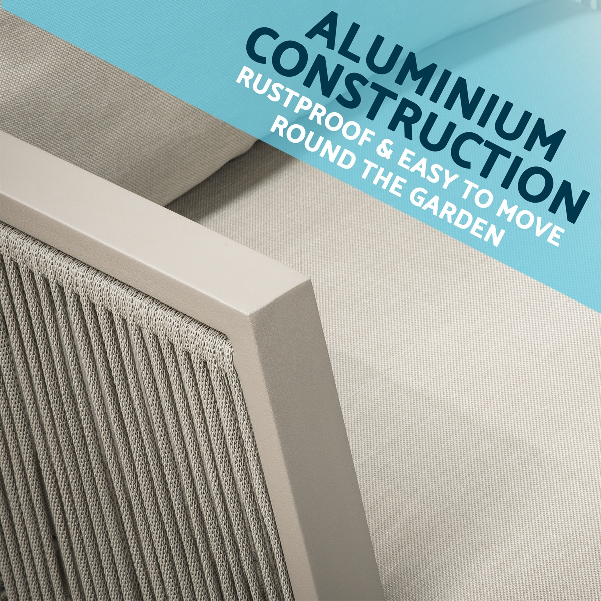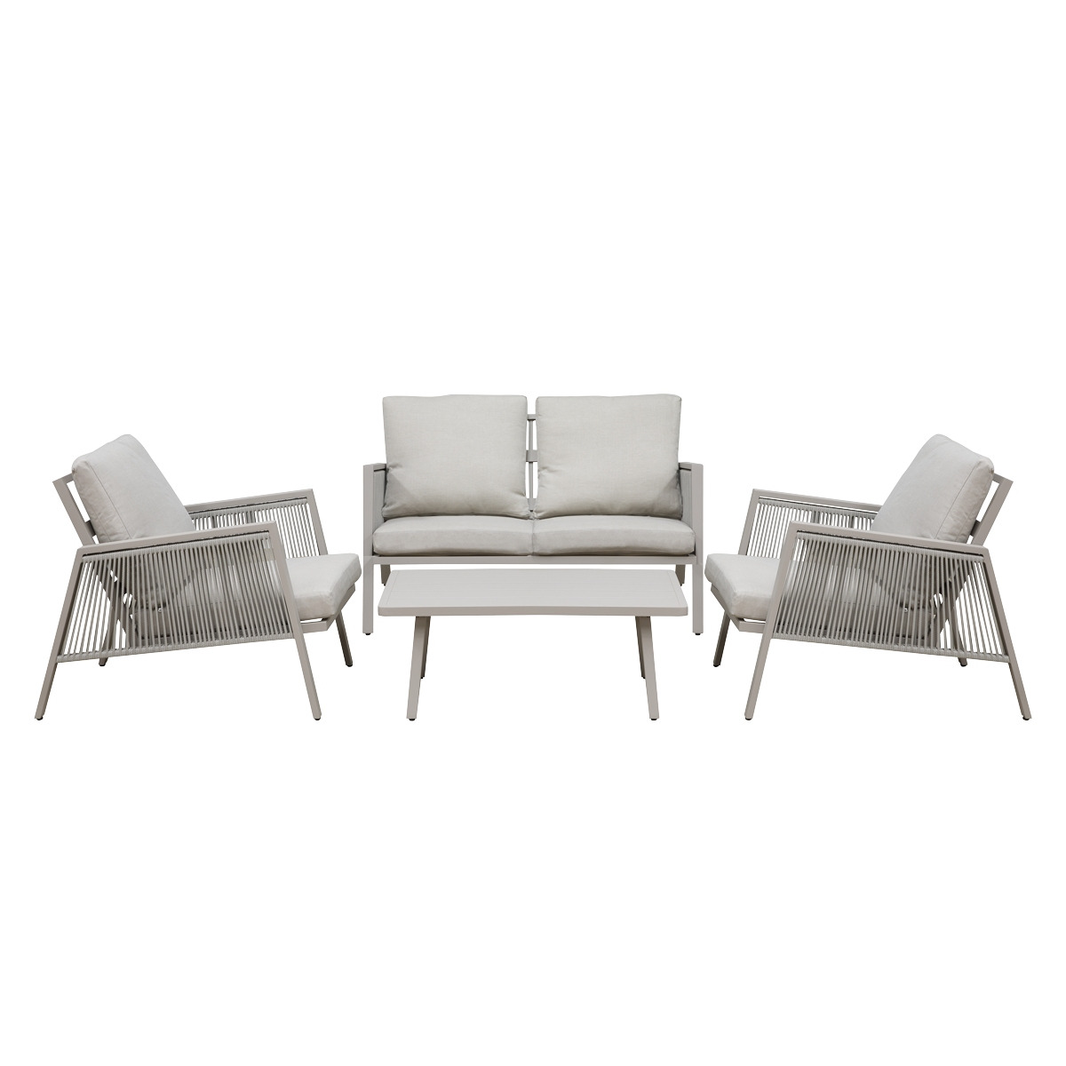 STRONG & DURABLE - Manufactured using powder coated aluminium. SET INCLUDES – 2-Seater sofa, 2x armchairs and aluminium table. Supplied with 8cm thick seat and back cushions. CONTEMPORARY DESIGN – Featuring Ø8mm round weatherproof Textilene® rope. QUICK & EASY TO BUILD - Some simple assembly is required. DIMENSIONS (W x D x H) – 2-Seater Sofa: 122.5 x 87.5 x 72.5cm, Armchair: 65.5 x 87.5 x 72.5cm, Table: 90 x 55 x 35.5cm. 3 YEAR GUARANTEE* - Giving you peace of mind. Disclaimer: Colours may vary slightly due to lighting conditions.