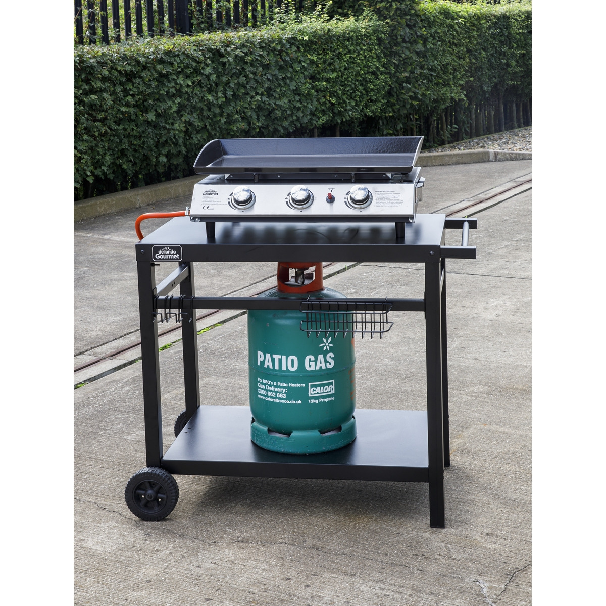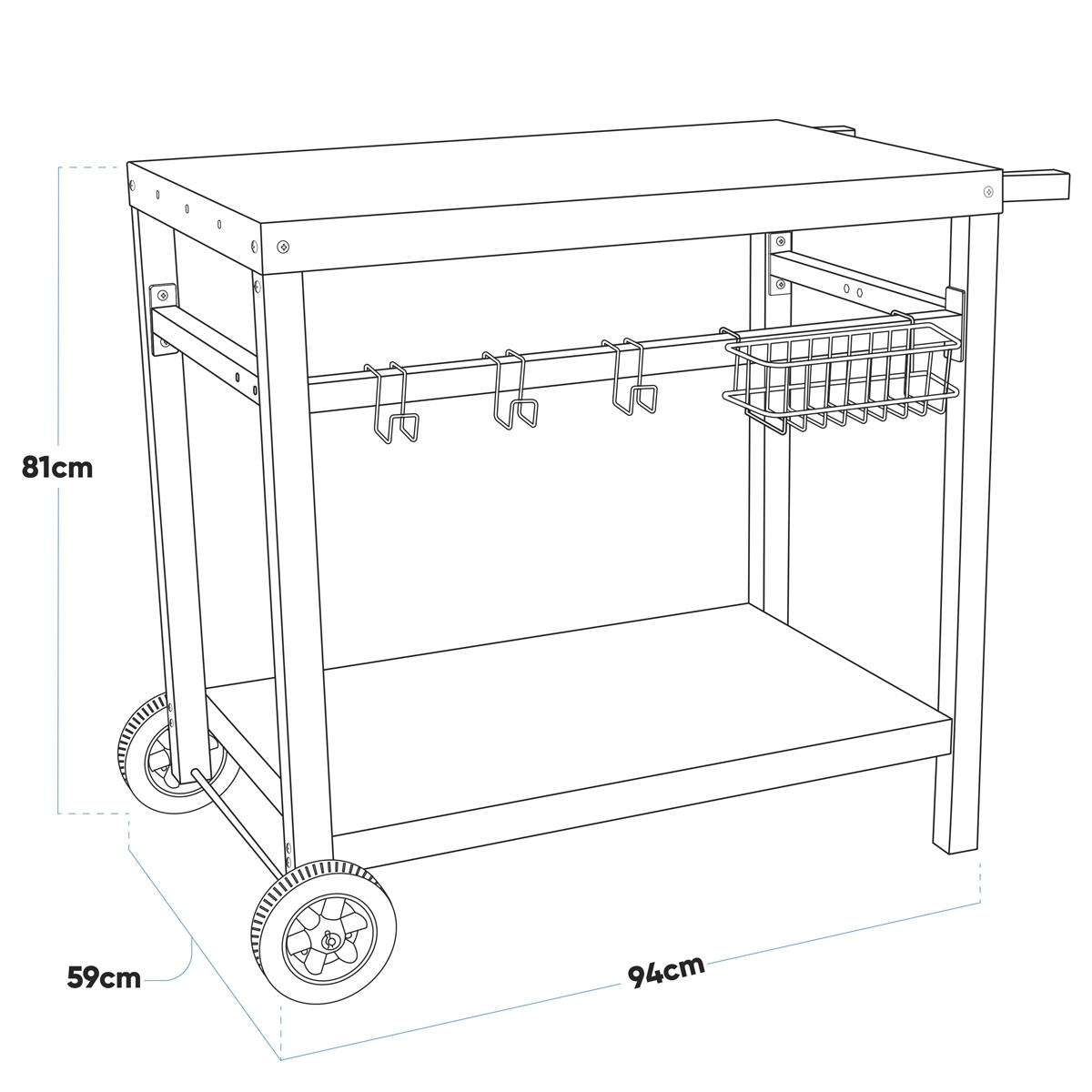 SUITABLE FOR OUR FULL RANGE OF PLANCHAS - Model No's DG21, DG22 & DG23. EXTRA SURFACE SPACE - Can also be used as a side table for your barbecue. EASY TO MOVE - Features two 6" PE wheels and side handle for manoeuvrability. PROVIDES PLENTY OF STORAGE - Supplied with powder coated steel basket and hanging hooks to store all your barbecue utensils. COMPATIBLE WITH – Gas bottles up to 13kg. QUICK AND EASY TO ASSEMBLE - No complicated instructions, just some simple assembly required and then you're good to go. DIMENSIONS – Trolley (W x D x H); 94.5 x 59 x 81.5cm, Top Shelf (W x D); 85 x 50cm, Bottom Shelf (W x D); 76.5 x 48.5cm.