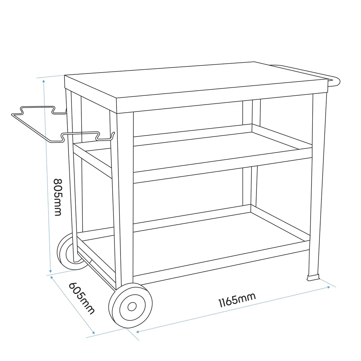 - DIMENSIONS - Trolley (W x D x H): 116.5 x 60.5 x 80.5cm, Top Shelf (W x D): 85 x 50cm, Middle Shelf (W x D): 81.5 x 46cm, Bottom Shelf (W x D): 83.5 x 48.5cm.