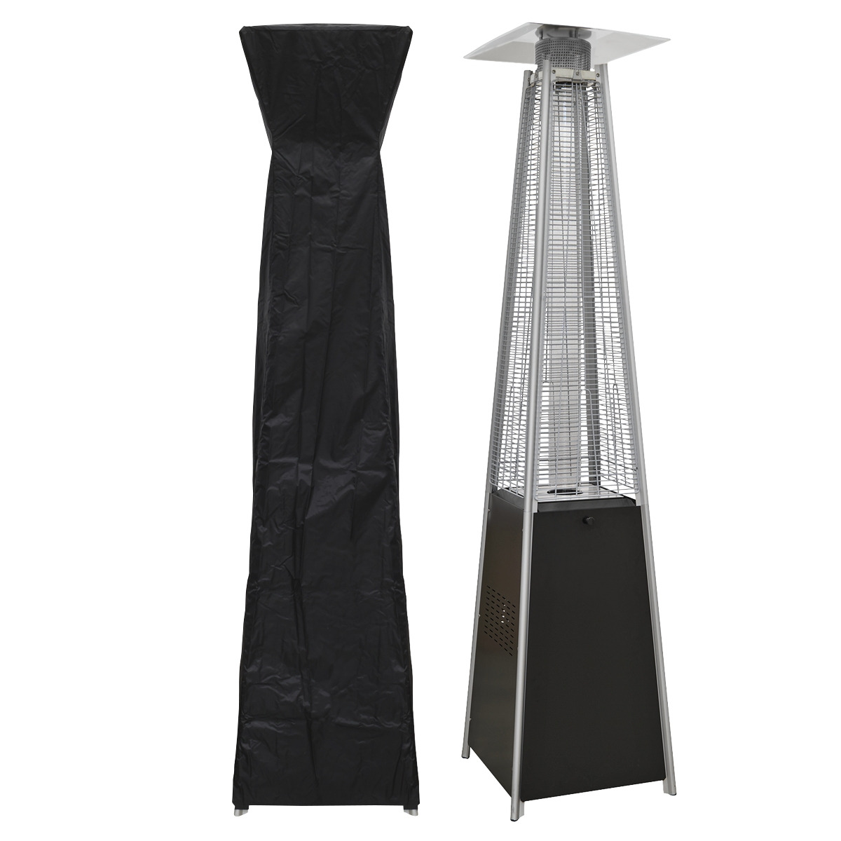 - INNOVATIVE DESIGN - This gas flame pyramid stands at 2.27m tall, when lit the heater produces a real flame encompassed by a glass tube and heats the surrounding area. A metal reflector makes sure the heat is directed downwards and outwards.