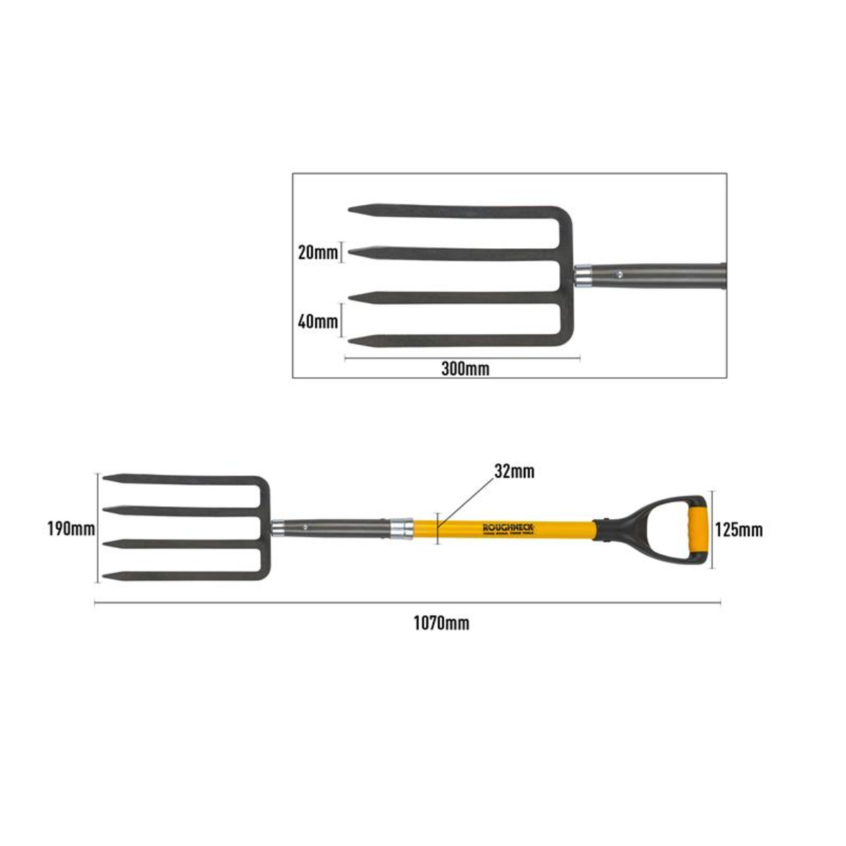 The Roughneck® Digging Fork is ideal for breaking up, aerating and turning over soil, spreading and removing debris. Built to last, the heat-treated, heavy-duty tines have a corrosion-resistant, tumble lacquered finish. The Power Ring socket, steel-reinforced plug, provides a stronger blade to handle connection. With a tubular fibreglass shaft and a soft grip, D-shaped handle for comfort in use. Specification: Width: 180mm Overall Length: 1070mm (42in)