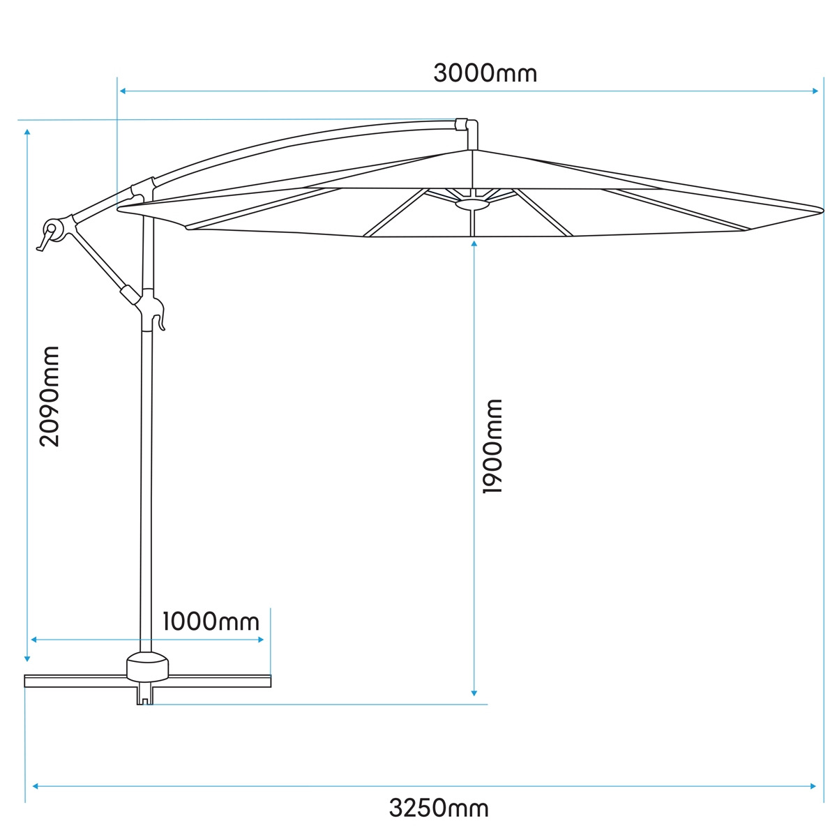 SUITABLE FOR VARIOUS OUTDOOR SETTINGS - Ø3m Diameter provides full shade for all garden, patio and other outdoor settings. EASY TO USE - Crank handle makes operation of this banana parasol seamless and effortless. STRONG MATERIAL - Parasol pole has a diameter of Ø4.8cm and is manufactured from durable steel. STABLE AND RELIABLE - Canopy is supported by eight strong steel ribs ensuring stability and shape at all times. OPTIONAL EXTRA - Parasol base is available separately under Model No. DG266.