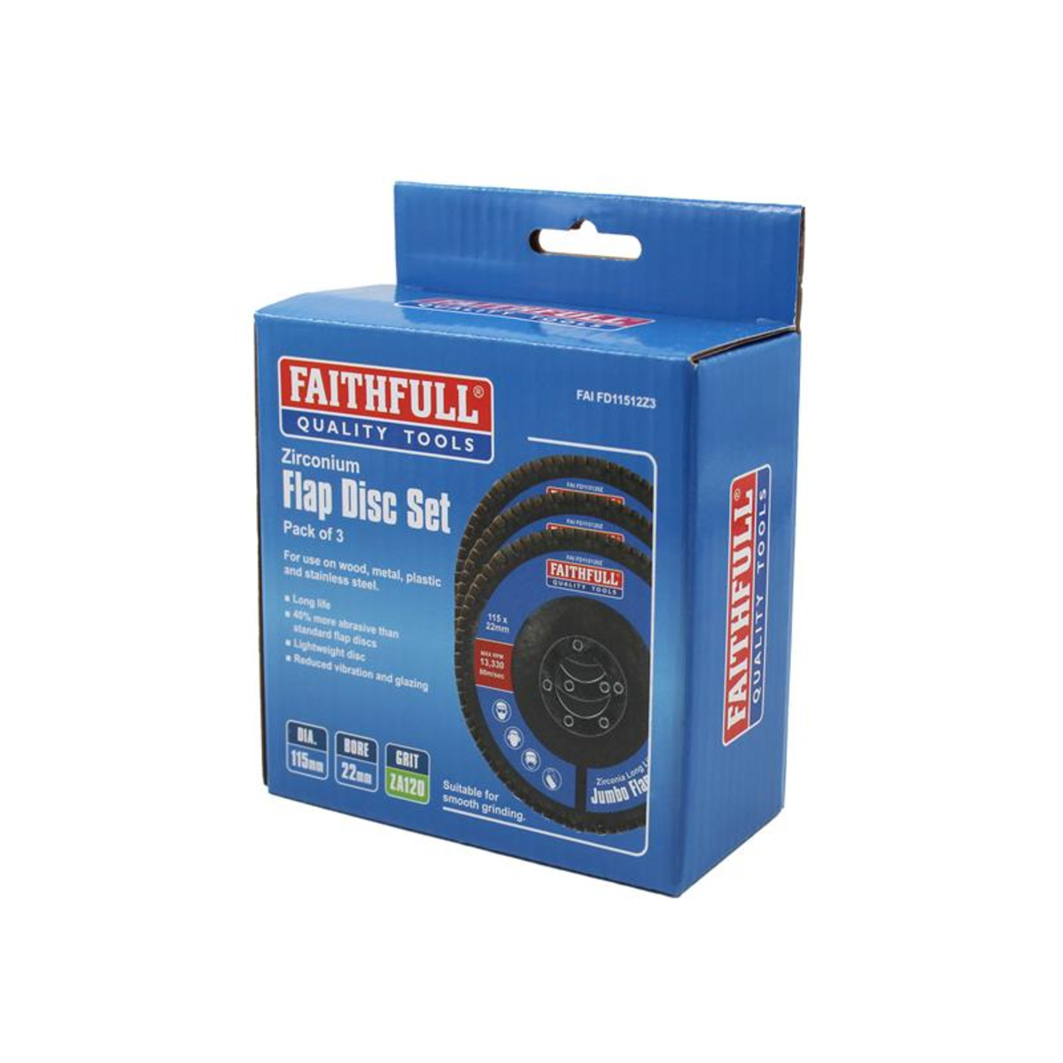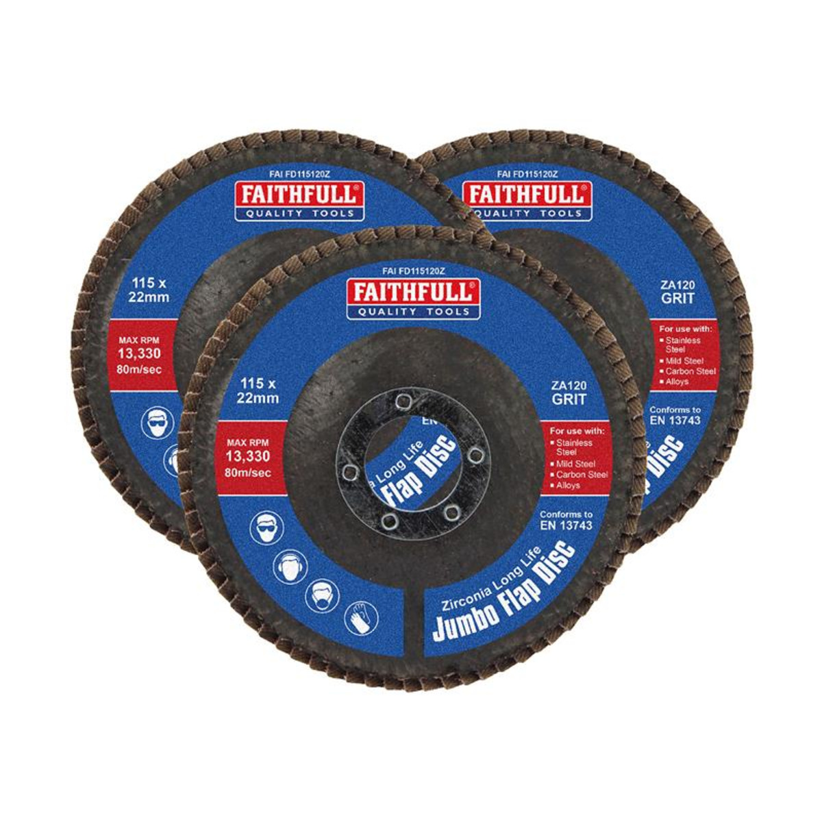 Pack of 3 Faithfull Zirconia Abrasive Jumbo Flap Discs 115 x 22mm 120 Grit.