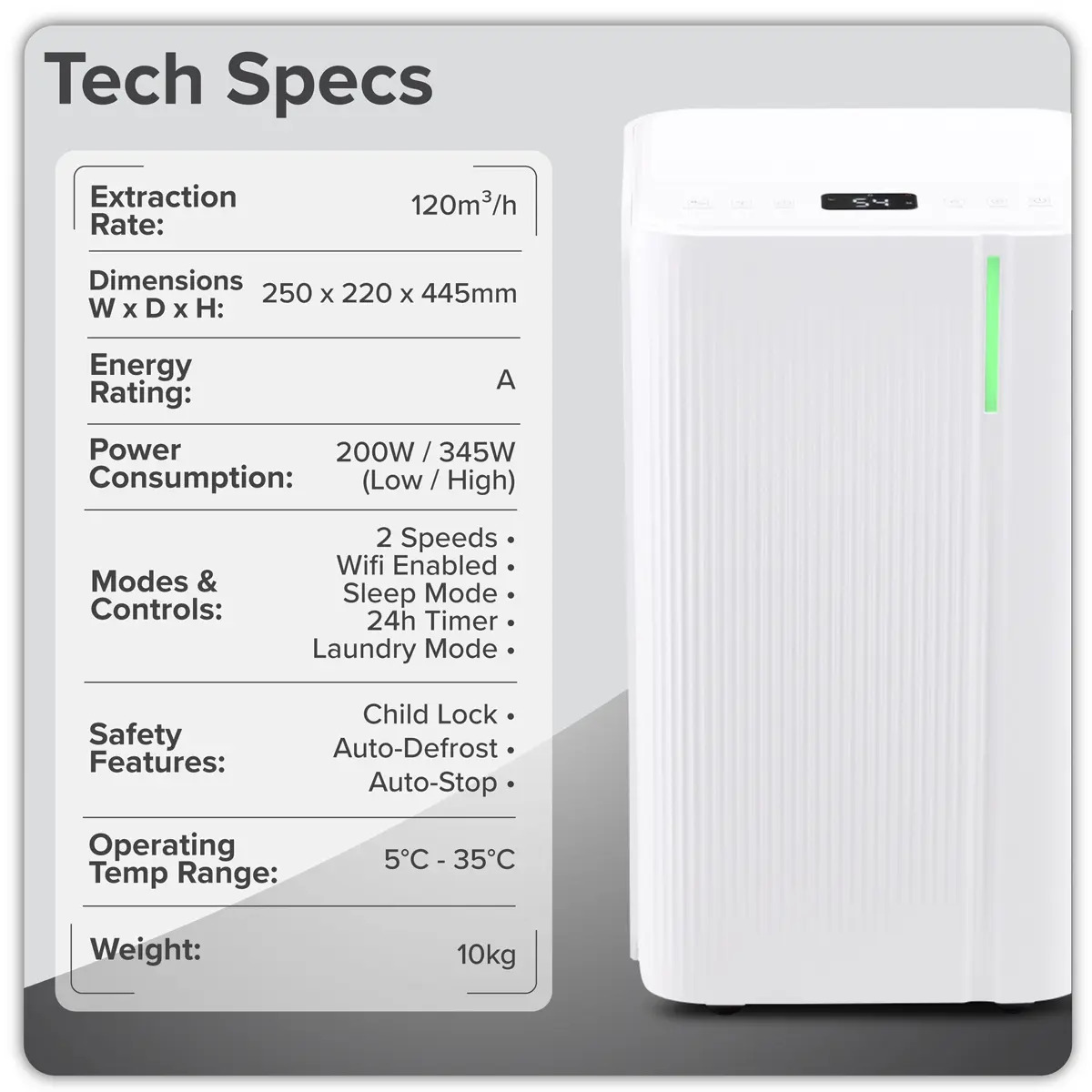 POWERFUL DEHUMIDIFIER - Can circulate and dehumidify 120m³/hr this is enough to clear multiple rooms with one single unit. HIGHLY EFFICIENT - Rated A-Class efficiency for low running costs. WI-FI ENABLED DIGITAL DISPLAY - Add the humidifier to either the TUYA or Smartlife apps and control your humidity from your smartphone. QUIET OPERATION - Reciprocating compressor ensures no distracting noise while in use working at a whisper quiet 38dB. PORTABLE UNIT - Compact design with four swivel castors and side handle makes moving the unit between rooms a breeze. SELECTABLE MODES - Auto mode, Laundry Mode and Sleep mode options. INDOOR DRYING - Laundry mode aids in the fast and effective drying of clothes inside. YEAR ROUND USAGE - Operates at temperatures as low as 5°C and as high as 35°C meaning this unit works perfectly at any time of the year. SAFTEY FEATURES - Automatic stop when tank is full, 24hr timer, child lock and auto-defrost.