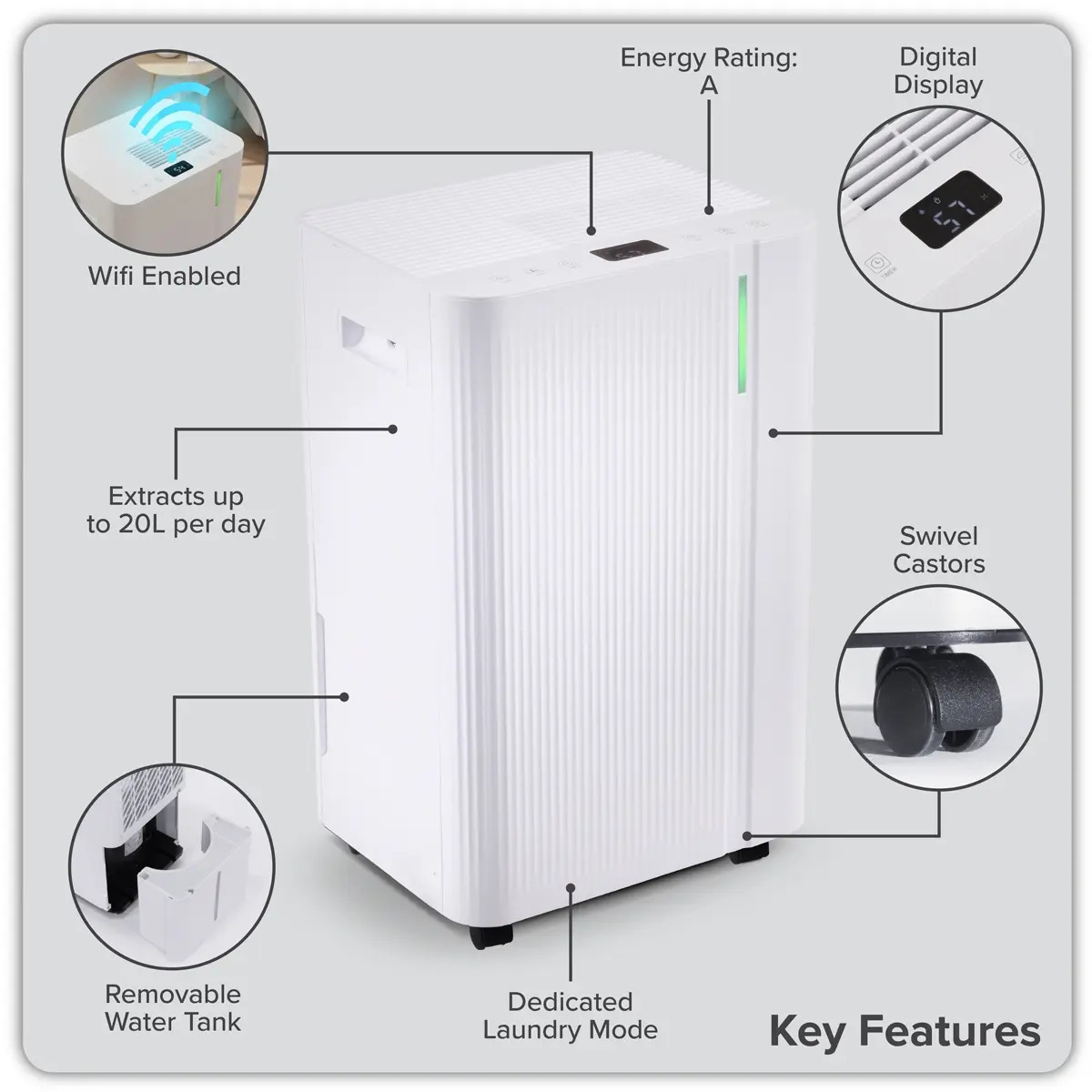 POWERFUL DEHUMIDIFIER - Can circulate and dehumidify 120m³/h this is enough to clear multiple rooms with one single unit. HIGHLY EFFICIENT - Rated A-Class efficiency for low running costs. WI-FI ENABLED DIGITAL DISPLAY - Add the humidifier to either the TUYA or Smartlife apps and control your humidity from your phone. QUIET OPERATION - Reciprocating compressor ensures no distracting noise while in use working at a whisper quiet 43dB. PORTABLE UNIT - Compact design with four swivel castors and side handle makes moving the unit between rooms effortless. SELECTABL MODES - Auto mode, Laundry Mode and sleep mode options. INDOOR DRYING - Laundry mode aids in the fast and effective drying of clothes inside. YEAR ROUND USAGE - Operates at temperatures as low as 5°C and as high as 35°C meaning this unit works perfectly at any time of the year. SAFTEY FEATURES - Automatic stop when tank is full, 24hr timer, child lock and auto-defrost.