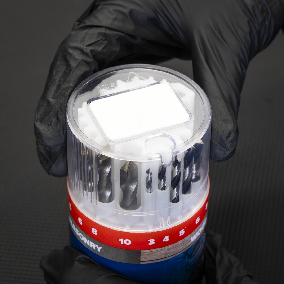 DISPLAY BOX - Assorted countertop display box featuring six 18-piece combination drill bit sets. CONTENTS - Six 18-Piece Combination Drill Bit Sets with a mixture of HSS, masonry and wood drill bits. APPLICATIONS - For use on a variety of surfaces including steel, cast iron, wood, brick and more. HSS DRILL BITS - Six HSS roll forged drill bits in each set (Ø3, 4, 5, 6, 8, 10mm). MASONRY DRILL BITS - Six Milled flute sand blasted masonry drill bits in each set (Ø3, 4, 5, 6, 8, 10mm). WOOD DRILL BITS - 6 x Brad point wood drill bits in each set (Ø3, 4, 5, 6, 8, 10mm). STORAGE- Supplied in cylindrical plastic storage cases.