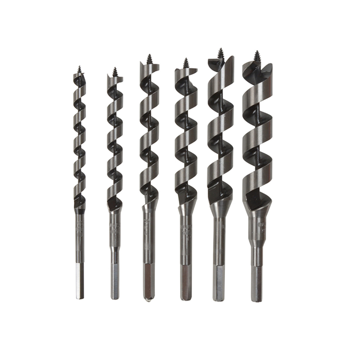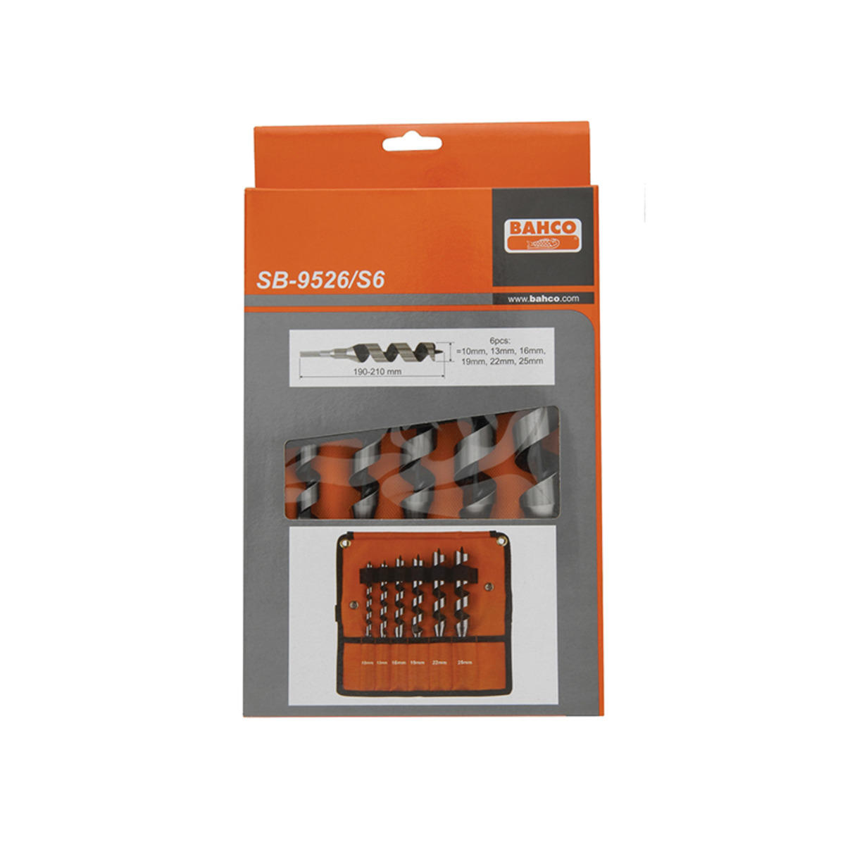 Bahco 9526 Combination Auger Bit Set, contains 6 of the most popular sizes. These are dual-purpose and can be used in both electric power drills and hand braces. With a single cutting edge for easy regrinding, though the need for regrinding is reduced as it is made from hardened tool steel for a longer cutting life.