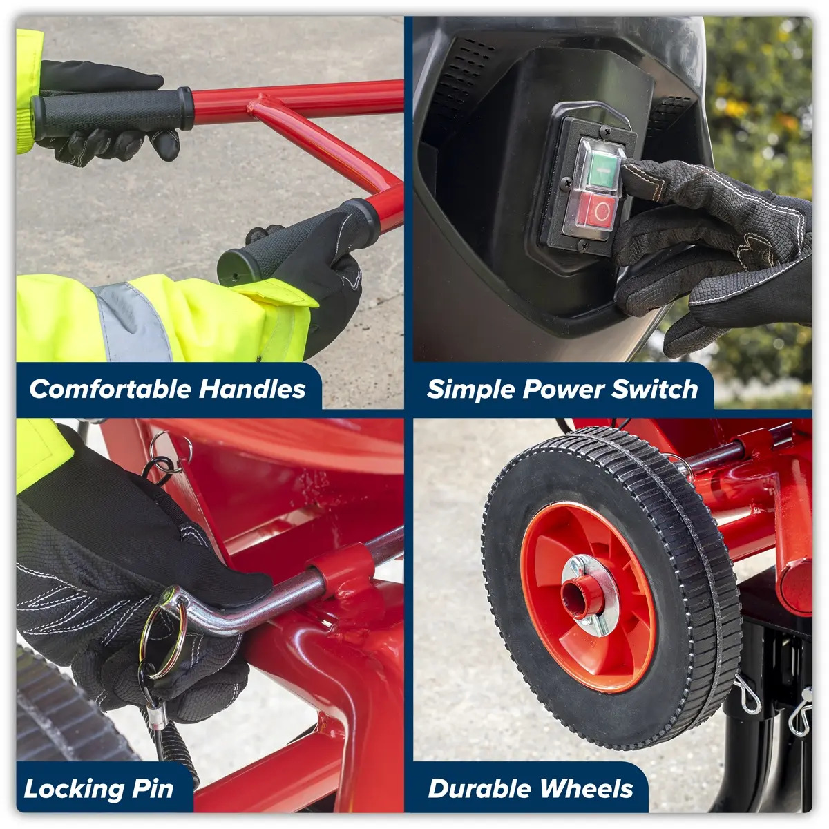POWERFUL - Powerful 550W insulated motor. GENEROUS - Large 135L drum with 100L mixing capacity. ADAPTABLE - Removable stand allows for either easier loading height, or down on its wheels for portability. EASY LOADING - Wide 385mm drum opening. DURABLE - Hard-wearing and robust design. TIPPING - Sturdy rubber grip handles for pouring cement out, when locking pin is removed.