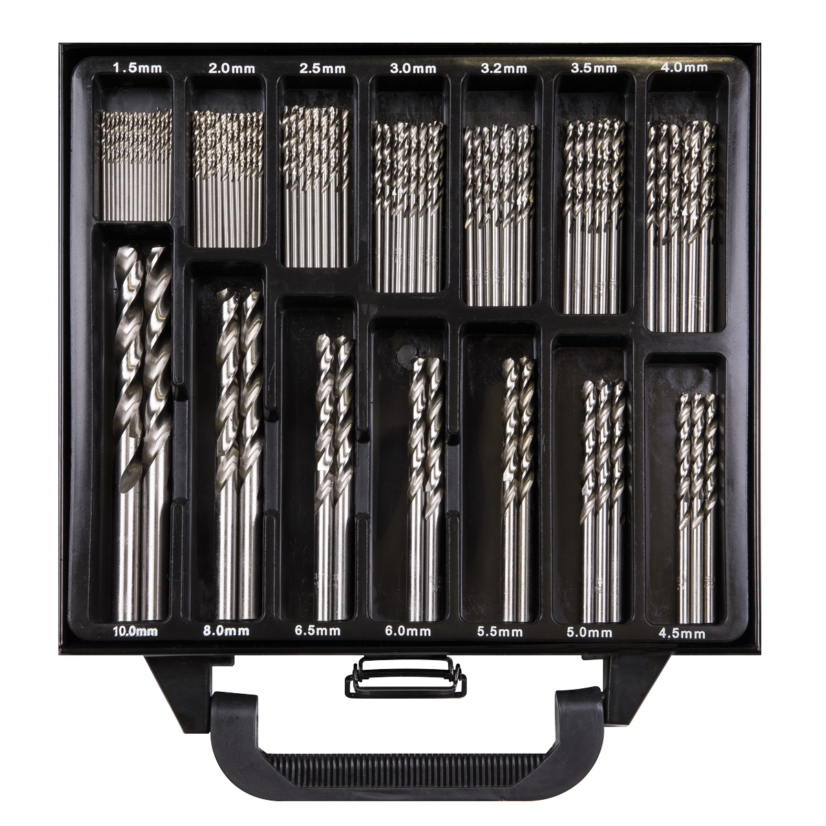 135° Split point is self-centring which helps to reduce thrust, friction and heat and aids easier penetration. Efficient clog-free swarf clearance. Contents Ø1.5 (x16), 2 (x16), 2.5 (x15), 3 (x10), 3.2 (x10), 3.5 (x8), 4 (x8), 4.5 (x3), 5 (x3), 5.5 (x2), 6 (x2), 6.5 (x2), 8 (x2), 10mm (x2). Supplied in a metal storage case.
