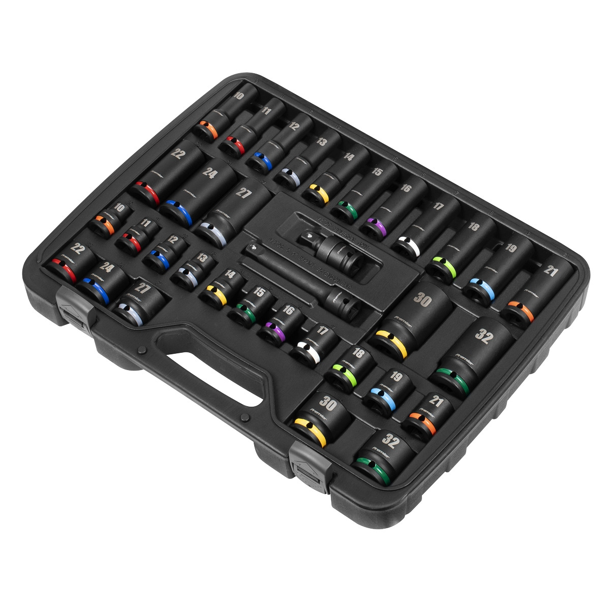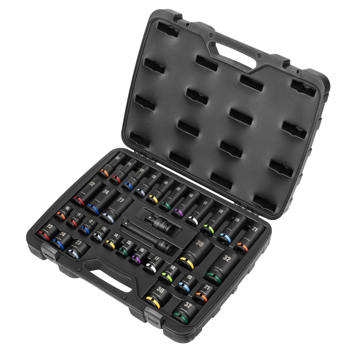 - 34PC SET – Contents Includes: Standard Sockets; 10, 11, 12, 13, 14, 15, 16, 17, 18, 19, 21, 22, 24, 27, 30, 32mm, Deep Sockets; 10, 11, 12, 13, 14, 15, 16, 17, 18, 19, 21, 22, 24, 27, 30, 32mm, 125mm Extension Bar, Universal Joint.