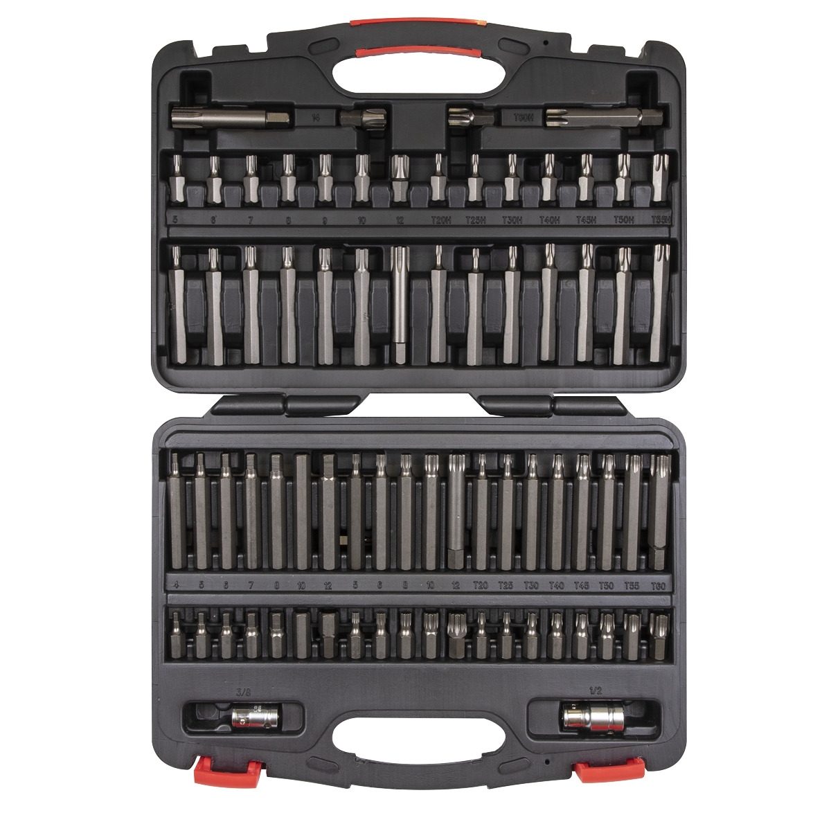 One of a comprehensive range of Premier Hand Tools, suitable for daily professional use. Chrome Vanadium 6150 steel bits, each size in 30 and 75mm lengths. Hardened and tempered for added strength. Set includes 3/8" and 1/2"Sq drive to 10mm hex Chrome Vanadium steel bit adaptors. Contents: TRX-Star* Bits; T20, T25, T30, T40, T45, T50, T55, T60 (1 each 30 and 75mm), Security TRX-Star* Bits; T20H, T25H, T30H, T40H, T45H, T50H, T55H, T60H (1 each 30 and 75mm), Hex Bits; 4, 5, 6, 7, 8, 10, 12mm (1 each 30 and 75mm), Ribe Bits; M5, M6, M7, M8, M9, M10, M12, M14 (1 each 30 and 75mm), Spline Bits; M5, M6, M8, M10, M12 (1 each 30 and 75mm), Drive Adaptors; 3/8"Sq x 10mm Hex, 1/2"Sq x 10mm Hex. Supplied in storage case with inclined tray and easy bit selection. Lifetime guarantee*.