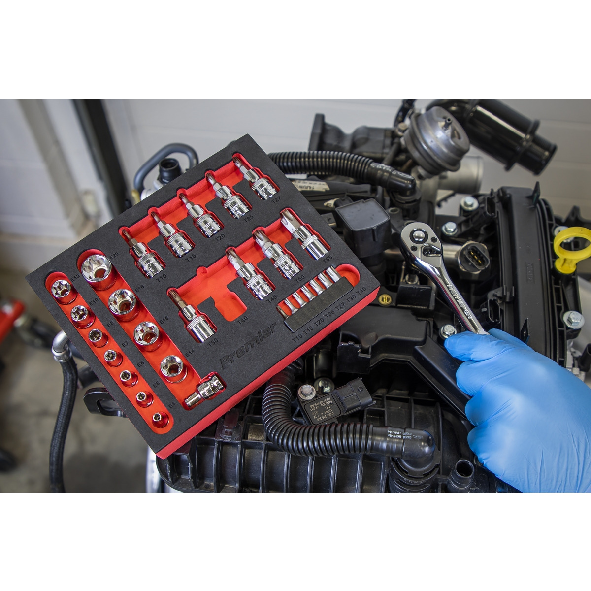 SEALEY PREMIER - One of a comprehensive range of Premier Hand Tools, suitable for daily professional use. DROP-FORGED CHROME VANADIUM – Steel sockets hardened, tempered for added durability with a fully polished mirror finish. KNURLED RING – For increased grip on sockets. BITS MANUFACTURED FROM S2 STEEL – For high impact resistance. 29PC SET - Includes male and female TRX-Star* sockets, security TRX-Star* bits and 3/8"Sq drive bit adaptor. SUPPLIED WITH EVA FOAM TRAY – For easy storage solutions. LIFETIME GUARANTEE*.