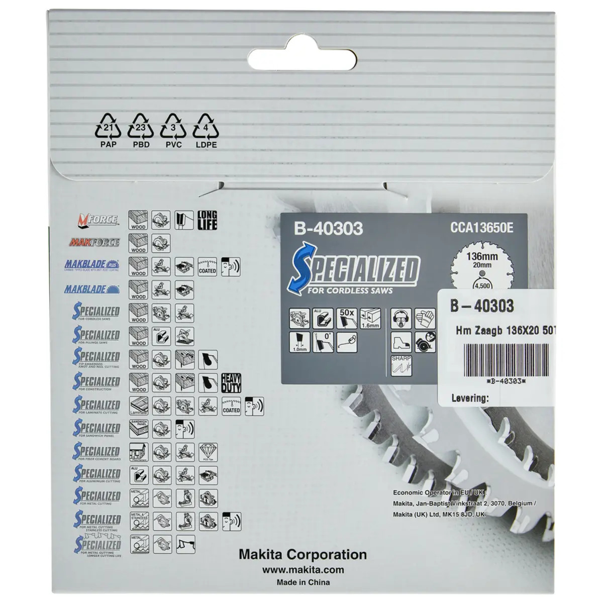 Makita B-40303 Circular Saw Blade, Specialized, TCT, 136x20mm, 50T