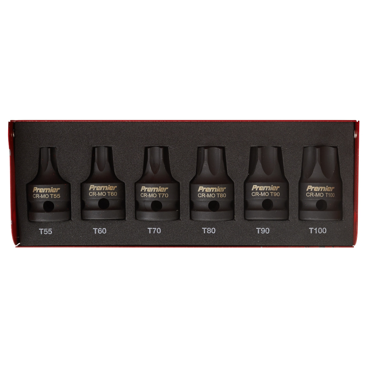One of a comprehensive range of Premier Hand Tools, suitable for daily professional use. Chrome Molybdenum steel impact sockets with 1/2"Sq drive. Phosphate finish for added corrosion resistance. Suitable for use with any impact tool. Sizes: T55, T60, T70, T80, T90, T100. Supplied in storage case. Lifetime guarantee*.