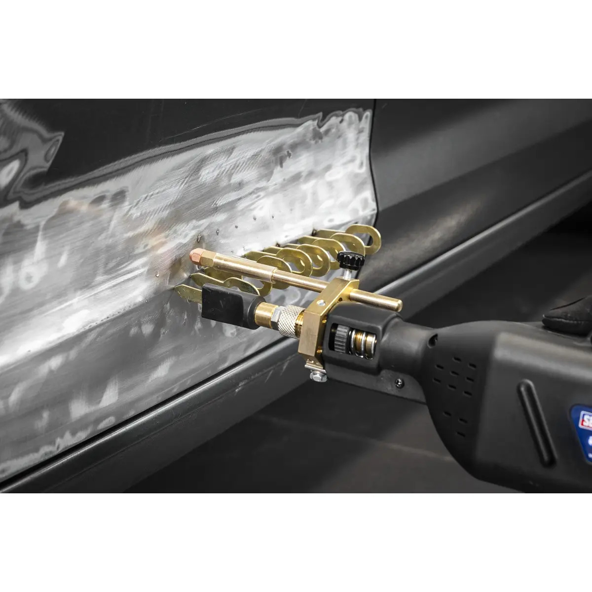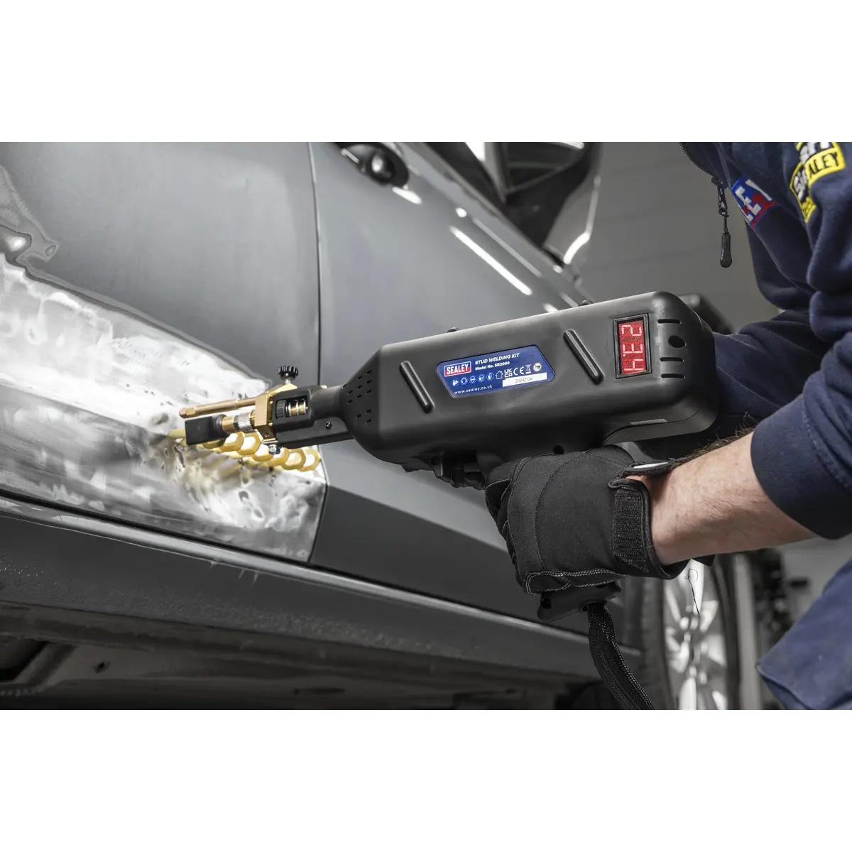 Supply: 230V-13A (13A Plug fitted). Professional quality stud welder for fast, efficient body repairs. Removes dents quickly, without holes or the need to remove interior trim. No burn through means that removal of studs and washers is easy and preparation work before repainting is minimized. Suitable for use on steel or aluminium and can weld studs, washers and tabs. Patented quick puller attachment allows removal of smaller dents without the need for studs or washers. Supplied in heavy-duty storage case.