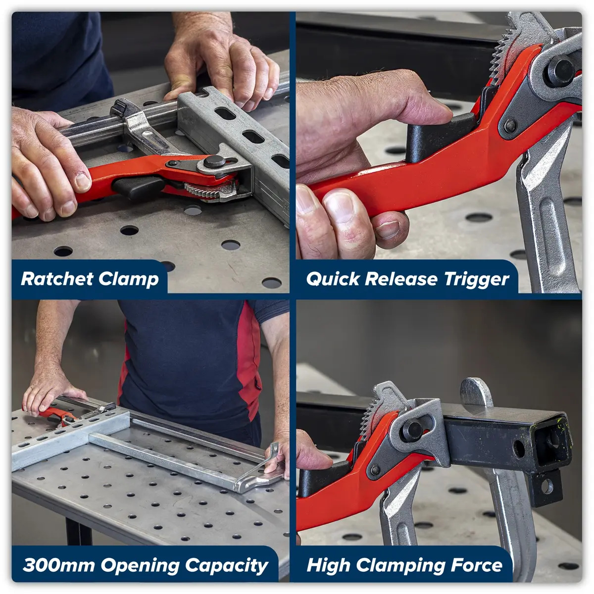 RATCHET CLAMP - Quick ratcheting clamp with easy release trigger. HIGH CLAMPING FORCE - Maximum clamping force of 480kg. OPENING CAPACITY - 300mm. THROAT DEPTH - 120mm.