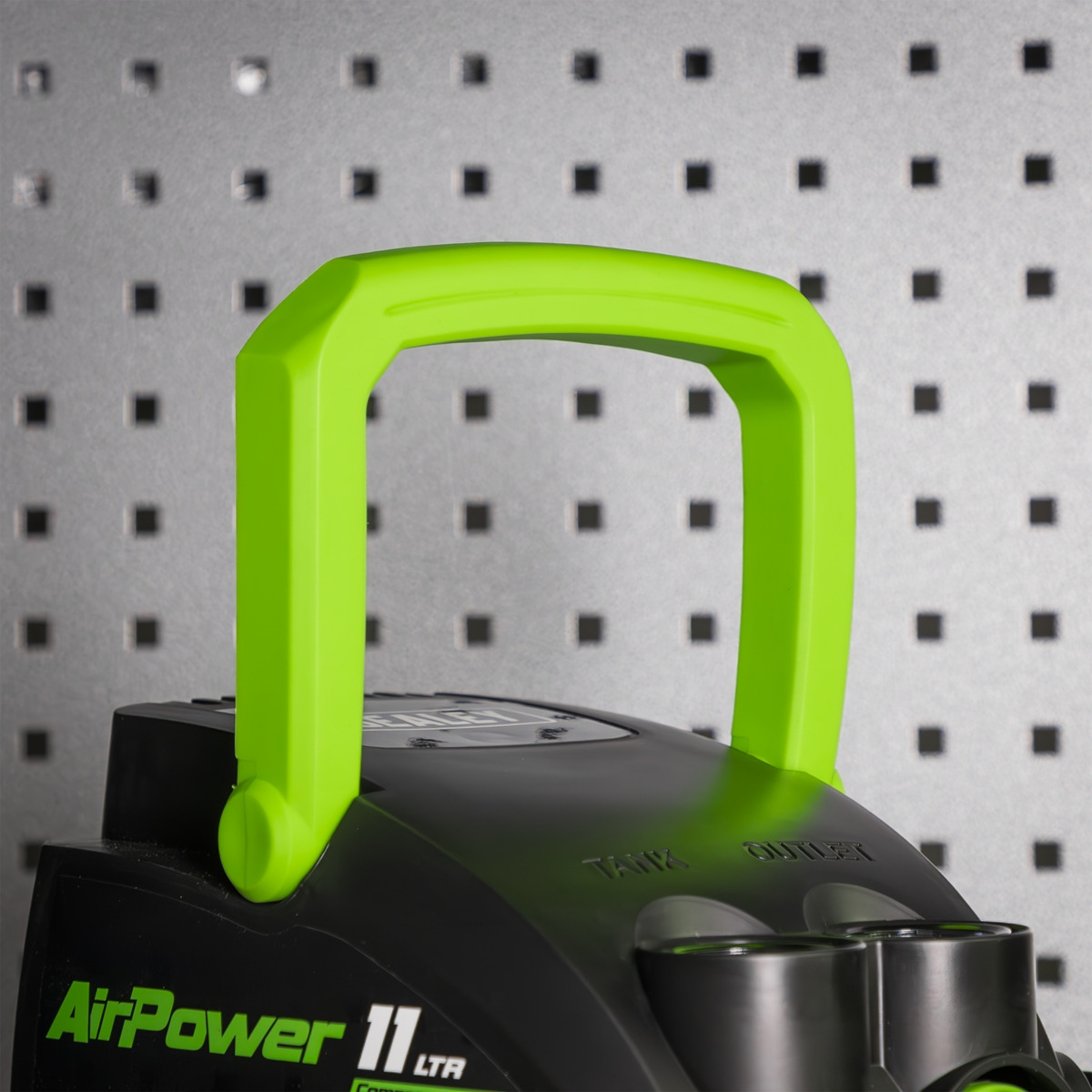 EASY TRANSPORTATION - Lightweight unit with carry handle and built-in cable tidy for easy manoeuvrability. OIL FREE - The benefits of oil free compressors include: easy maintenance, reduced noise levels, better efficiency, quieter when running and no oil contamination in the air supply. ALUMINIUM CONSTRUCTION - Aluminium cylinder head with cast iron cylinder gives added resistance to wear. AUTOMATIC CUT-OUT- Fitted with fully automatic pressure cut-out switch and tank gauge displaying pressure. RELIABLE AND QUIET - Pump head directly coupled to heavy-duty universal motor for reliable and quiet operation.