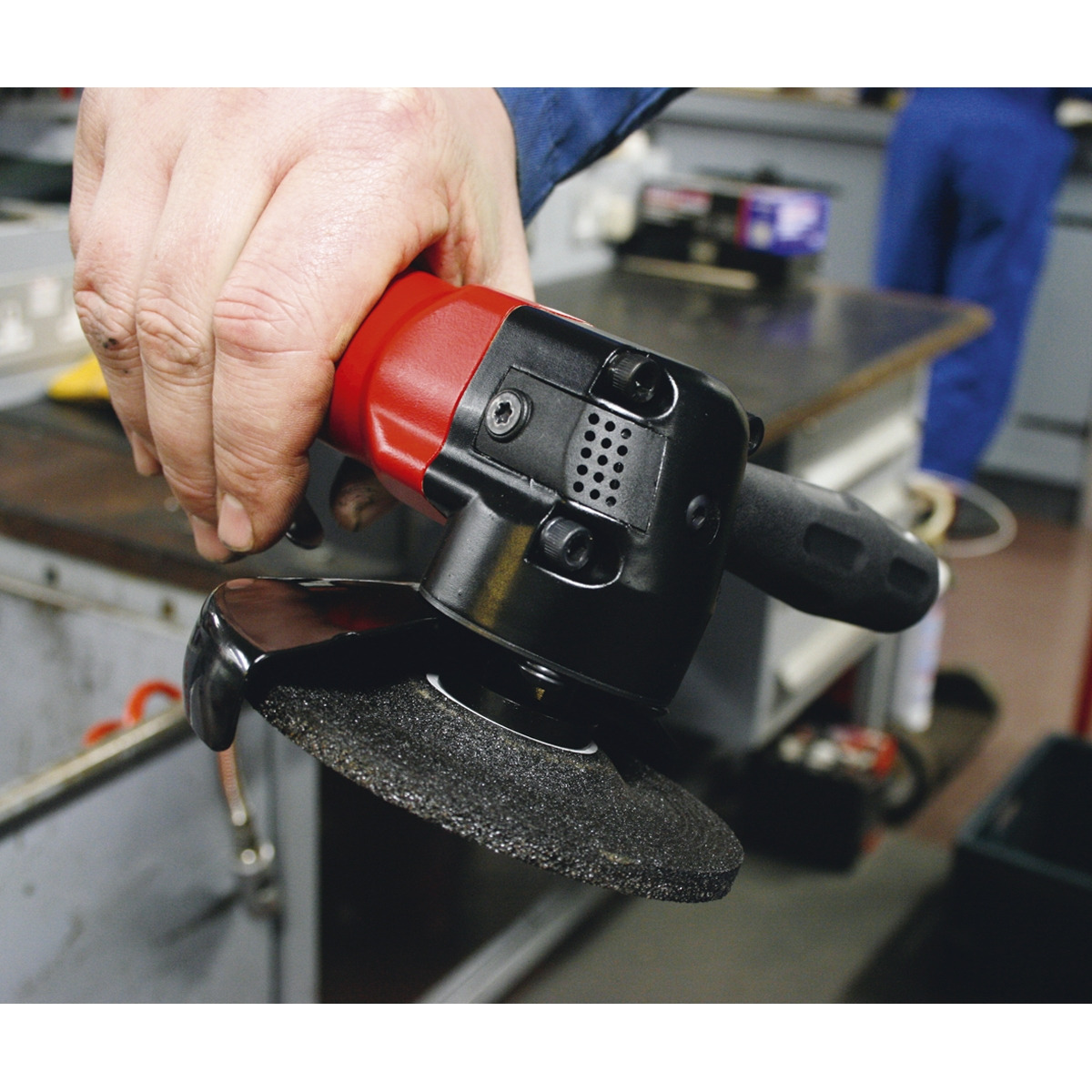 Aluminium body and bevel gear housing with steel disc guard. Well-balanced, multipurpose tool suitable for general workshop use. Free speed 10000rpm. Supplied with locking/pin spanners and safety instructions. Grinding Disc not included.