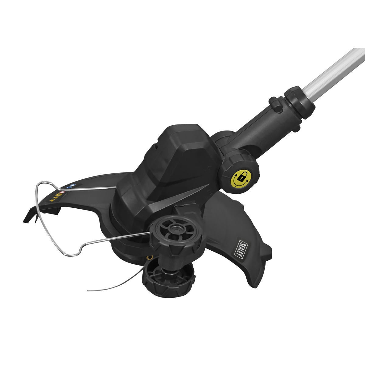 PART OF THE SV20 SERIES - Designed for the professional, offering heavy-duty, high performance, durable tools with lightweight composite designs for superior control and comfort. BATTERY POWERED - Operates using 2 x 20V batteries from the Sealey SV20 Series (batteries must be of the same Ah rating). EFFICIENT - Wide cutting width of 30cm. Bump feed line. 2-IN-1 - Fitted with wheels for grass strimming and edging. COMFORT - 90° Rotating head allows for a comfortable cutting angle.
