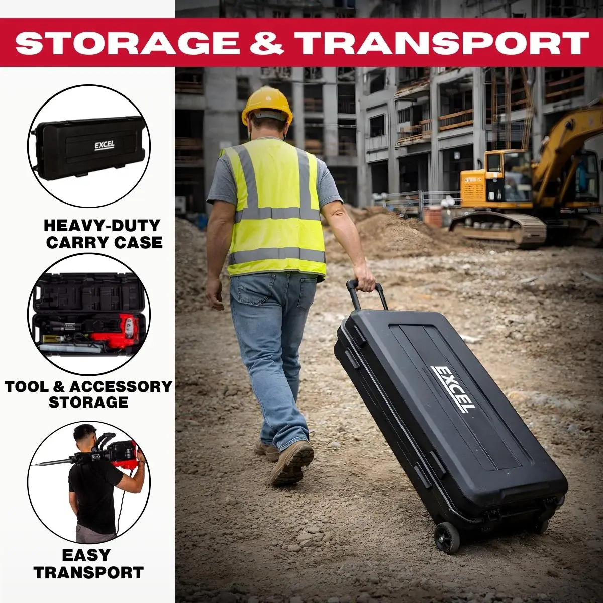 The Excel Electric Demolition Hammer delivers exceptional breaking performance with 55 joules of impact energy and a durable 1700W motor. Designed for heavy-duty demolition on concrete, brick, and masonry, it features a Hex 30mm shank for secure chisel fitting and quick bit changes. The lock-on trigger and adjustable side handle offer added comfort and control during long jobs. Supplied with a flat chisel, pointed chisel, and heavy-duty carry case, this breaker is built to perform and last.